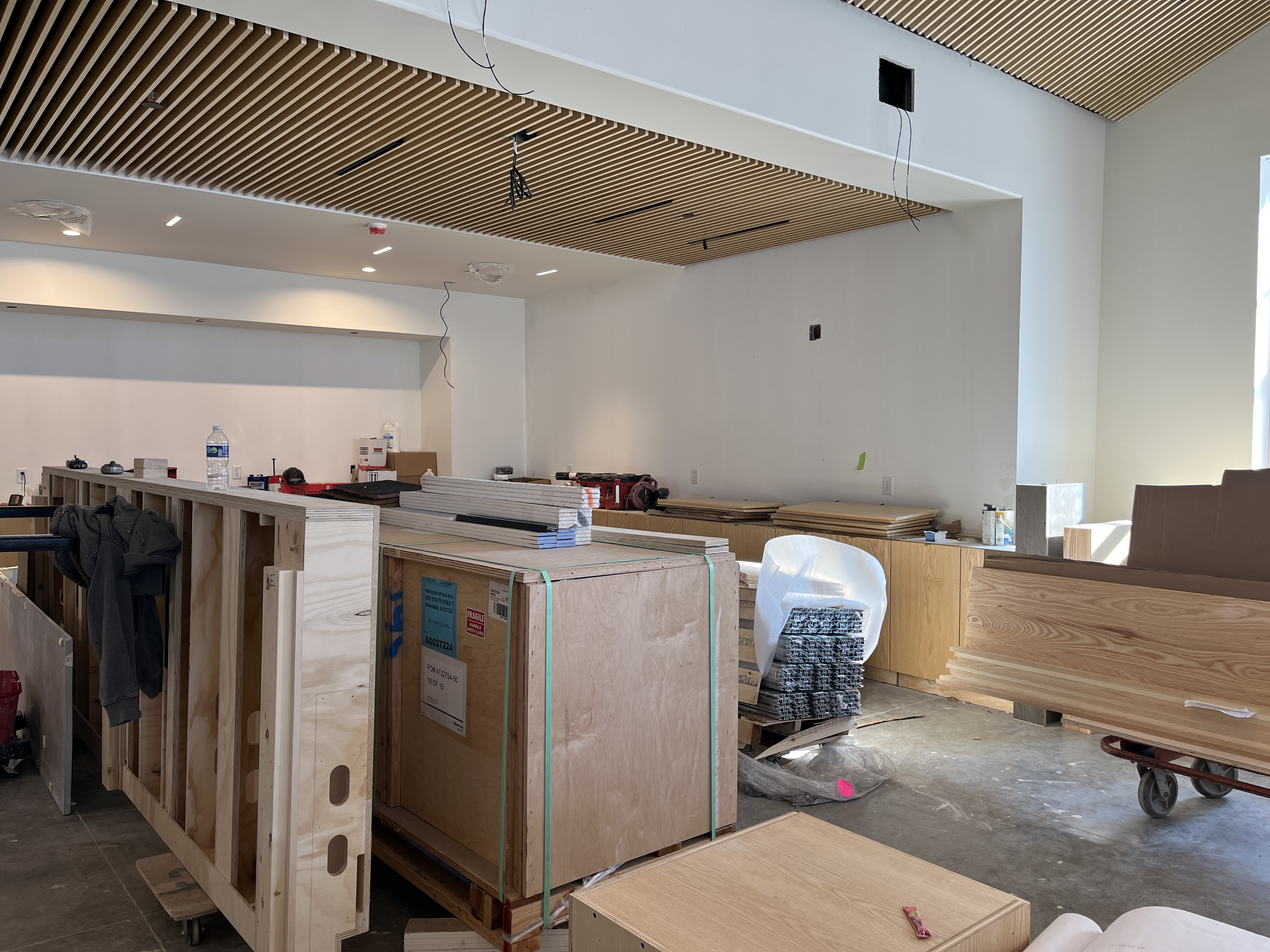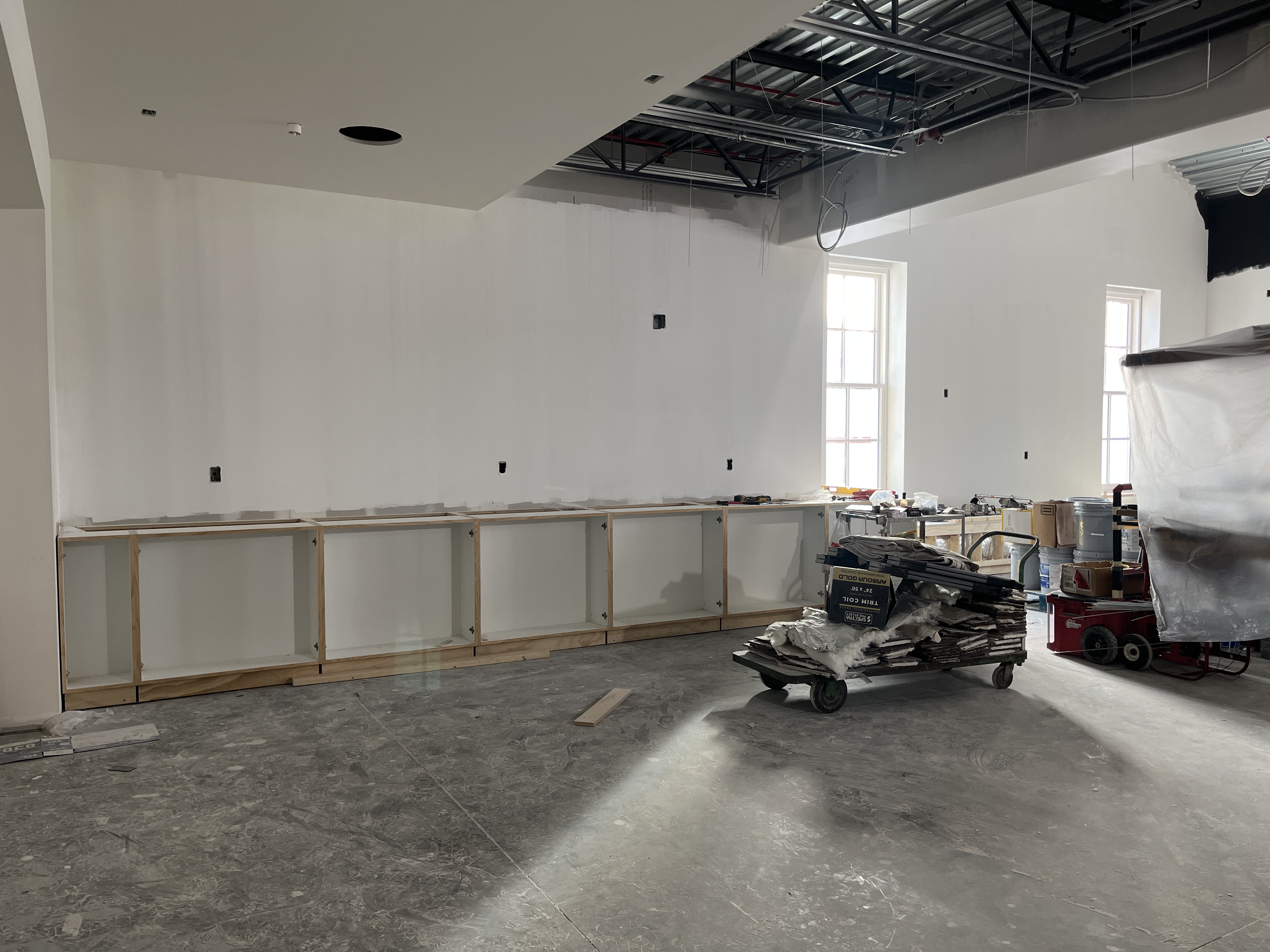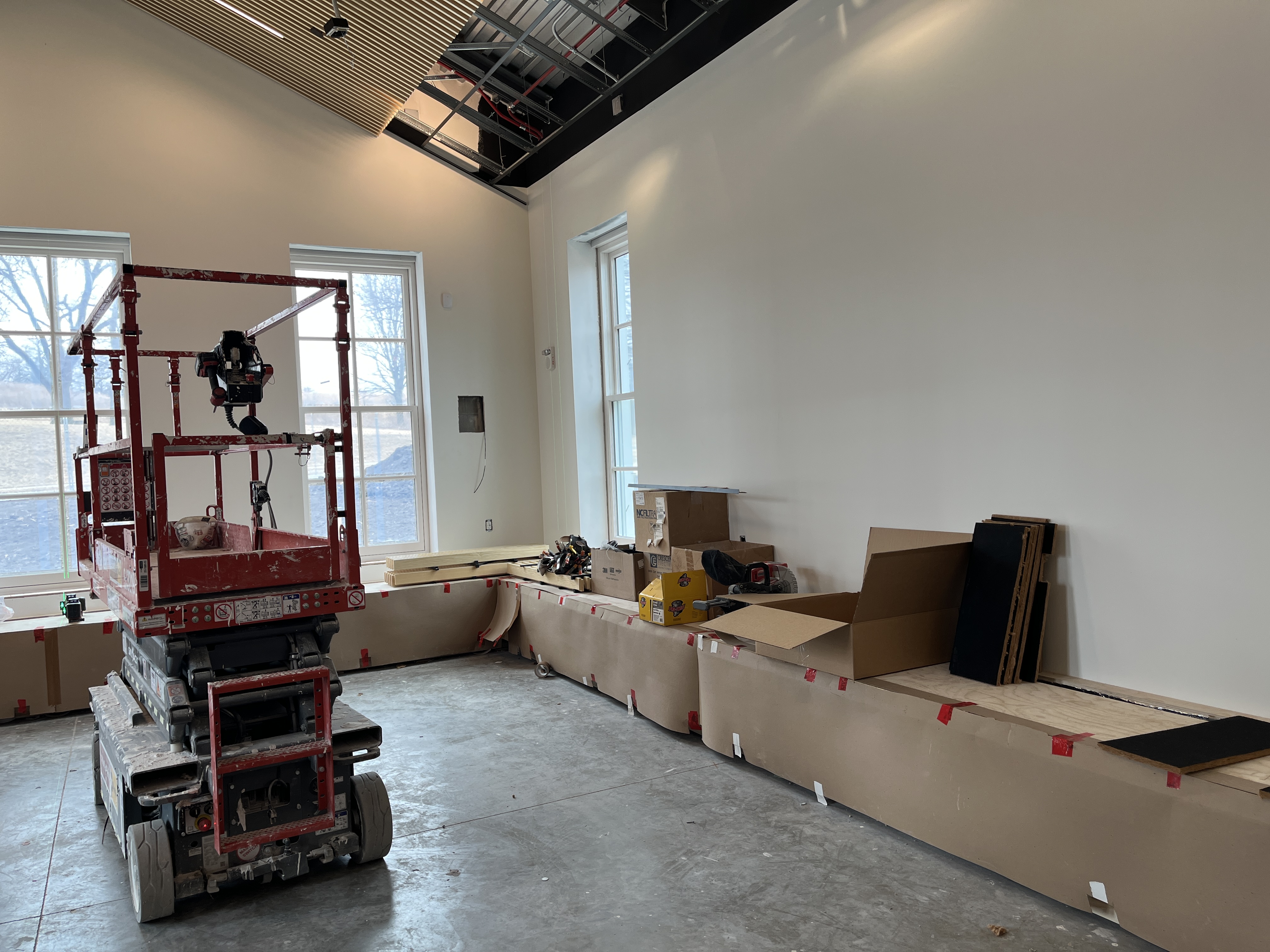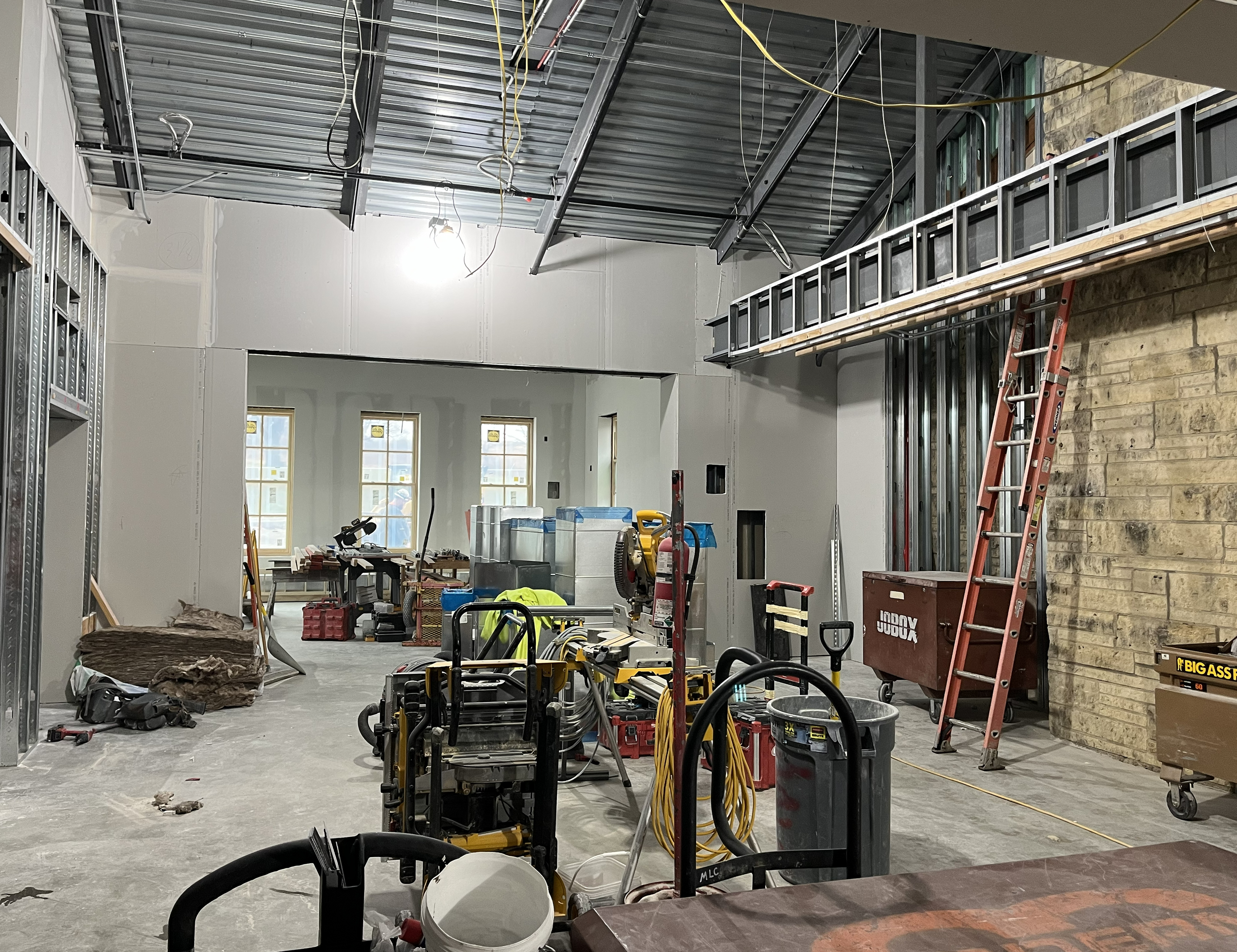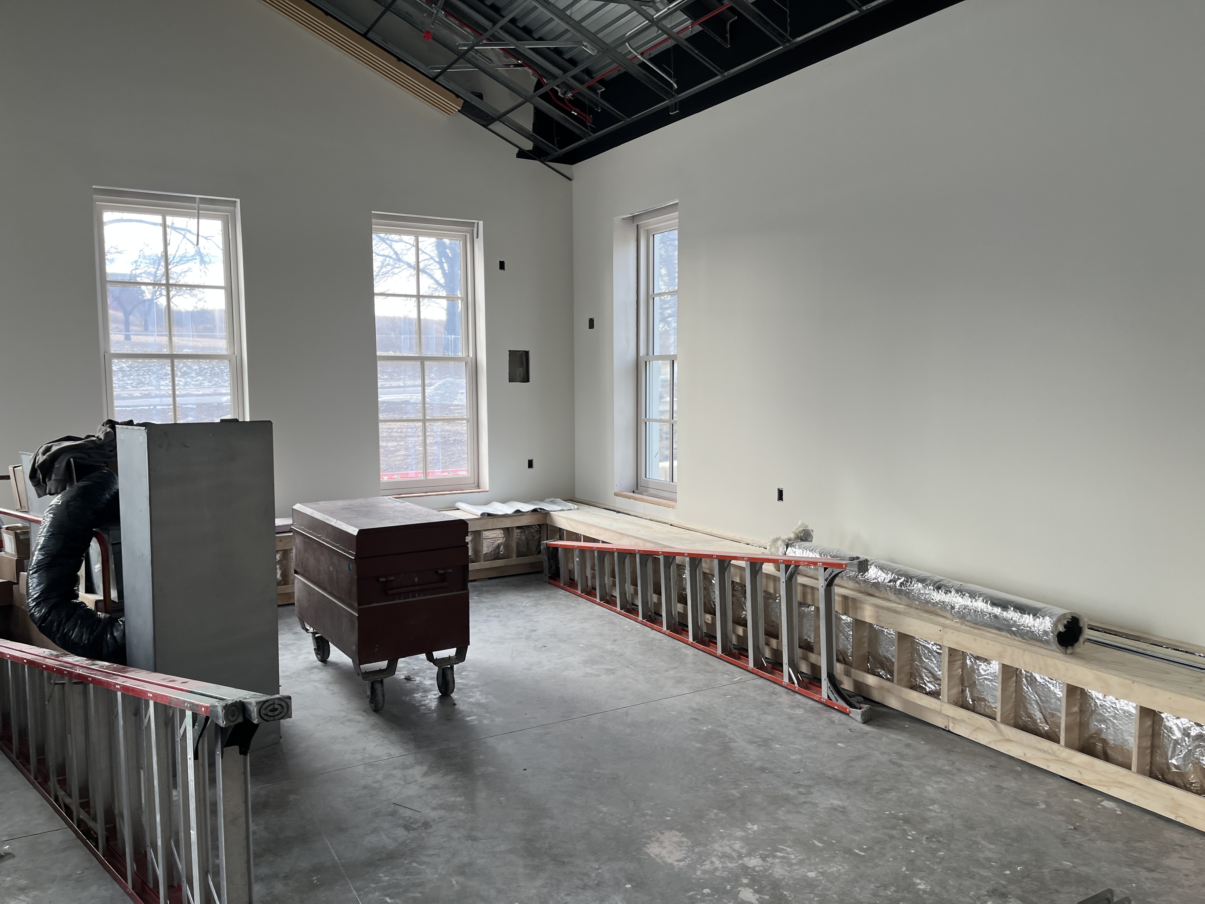 Silent video, pan shot of construction of museum expansion showing future reception desk and lobby area.