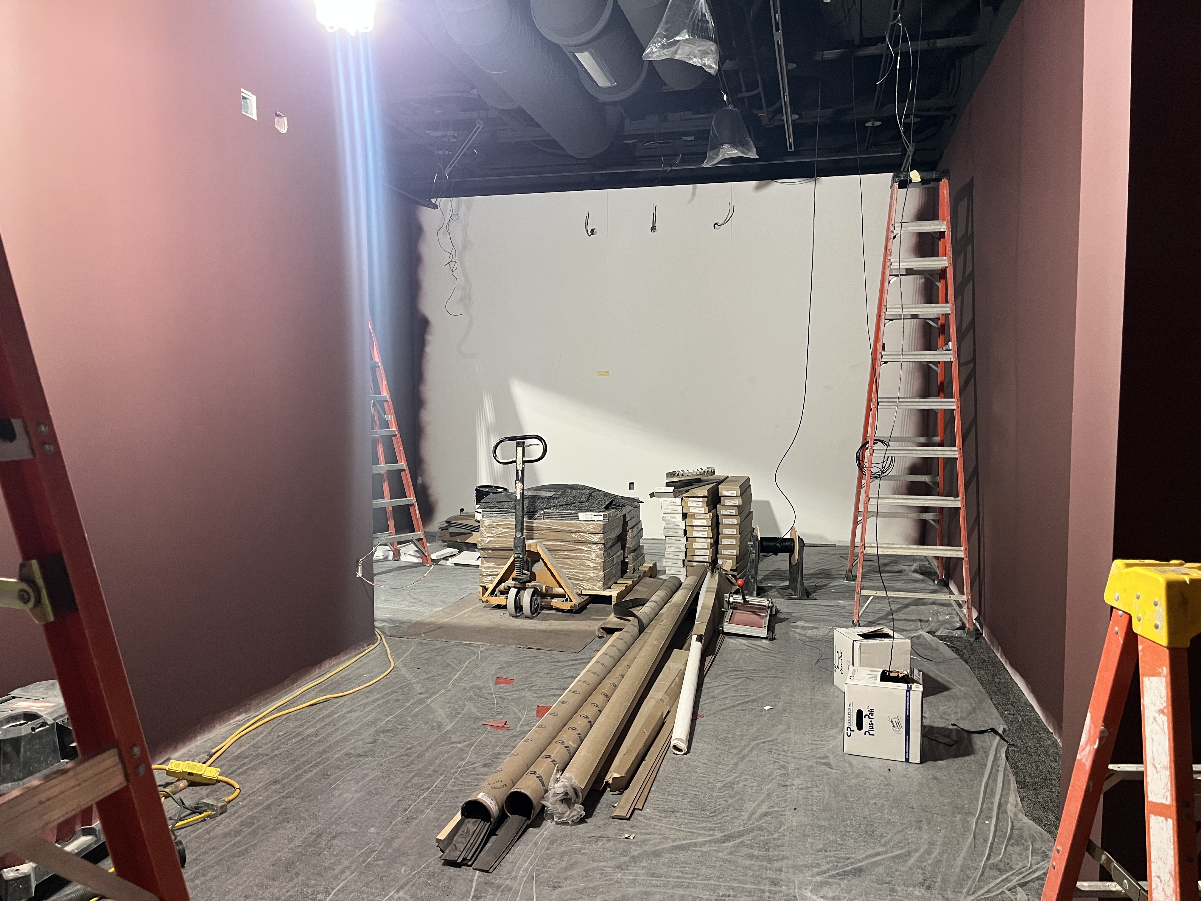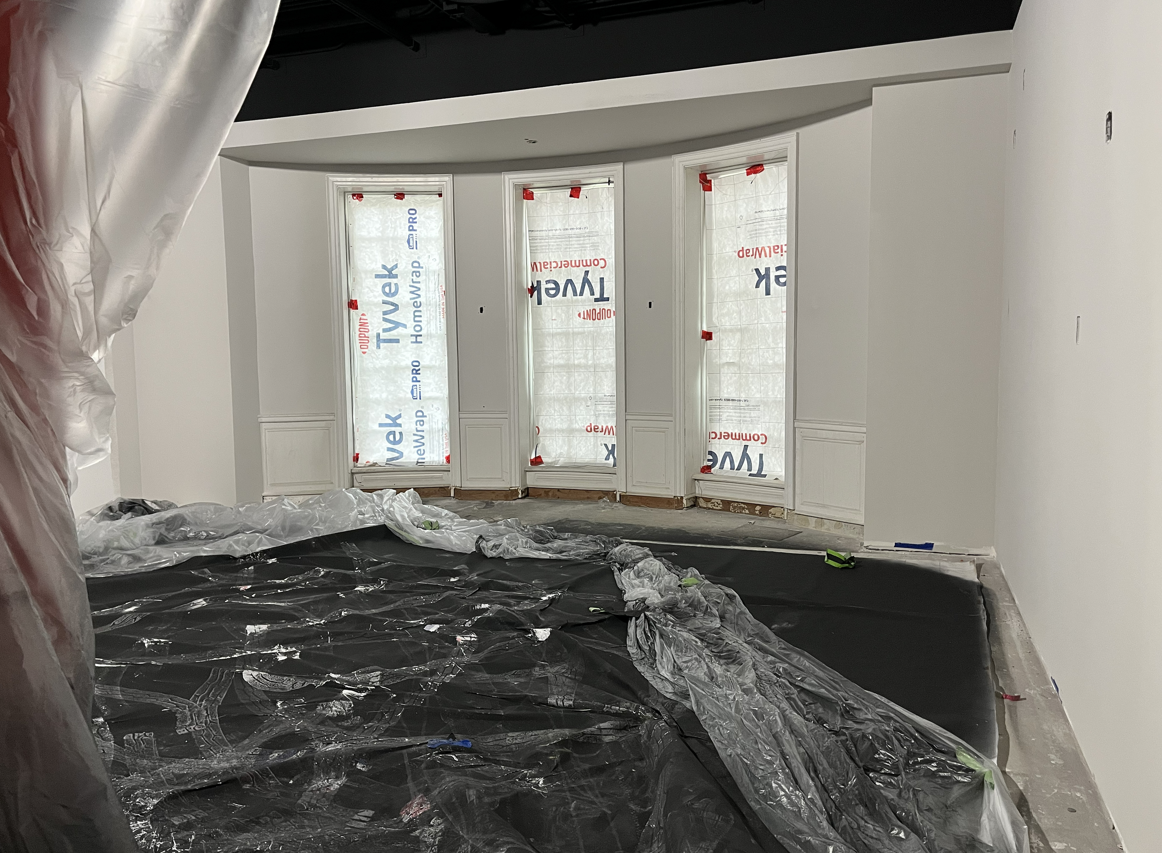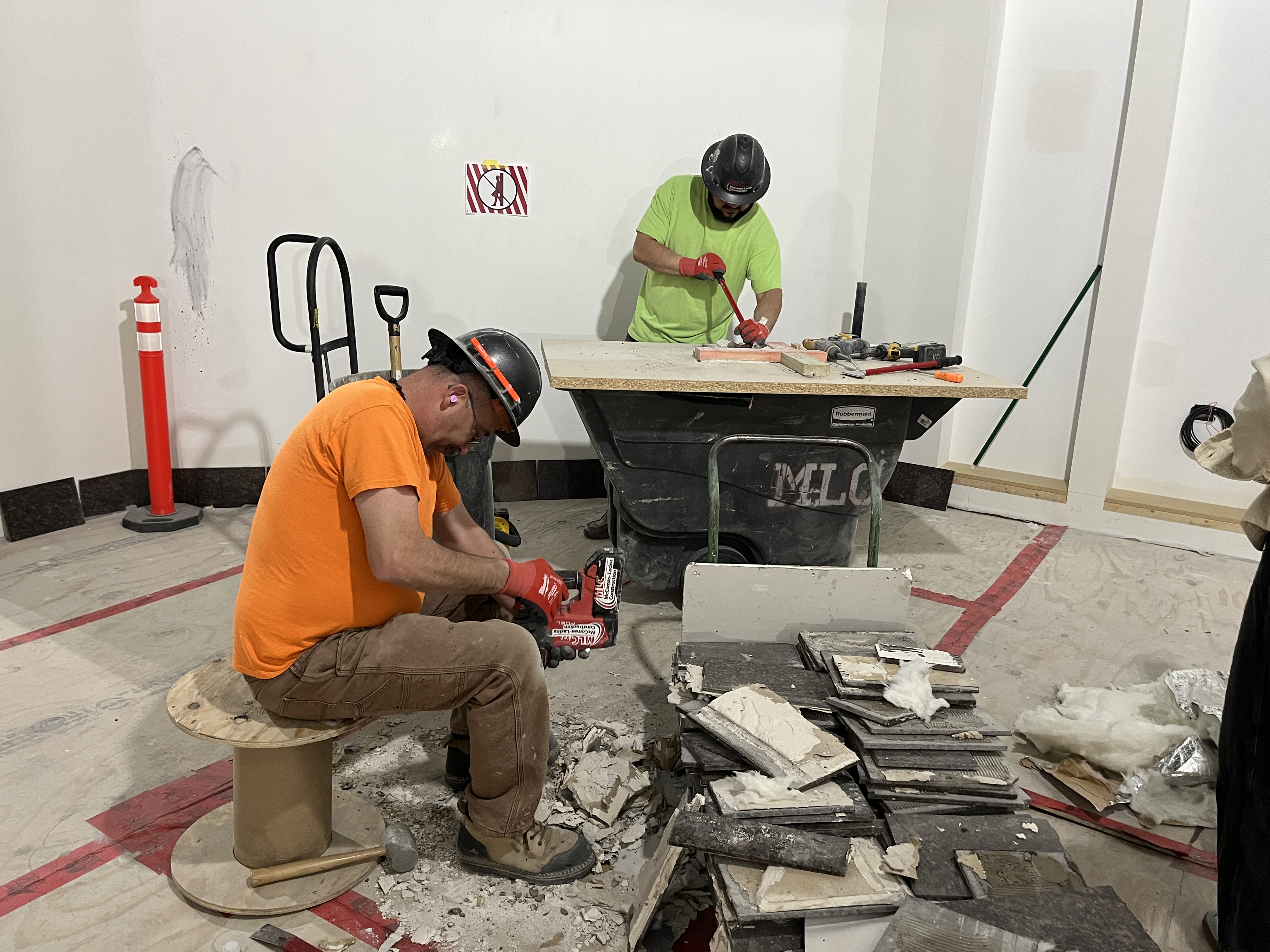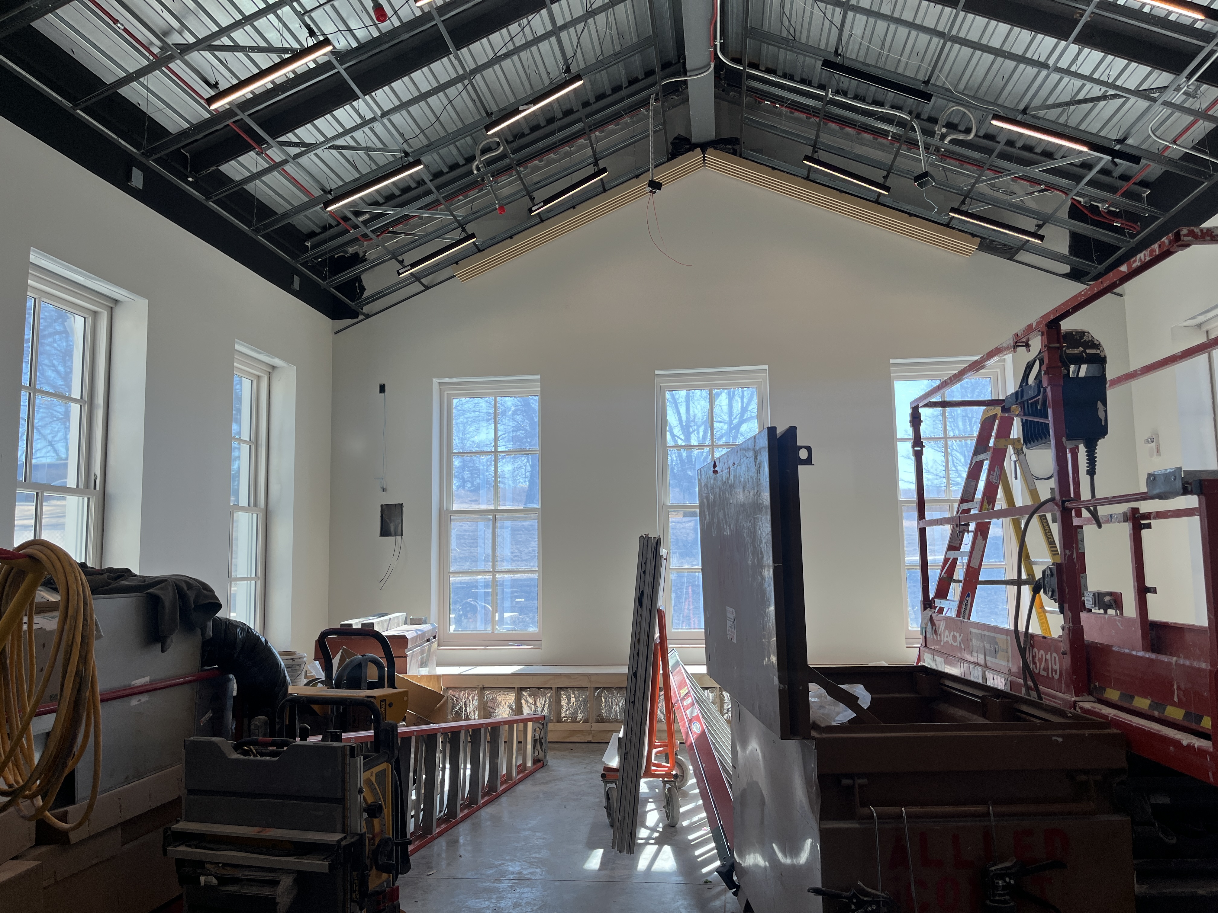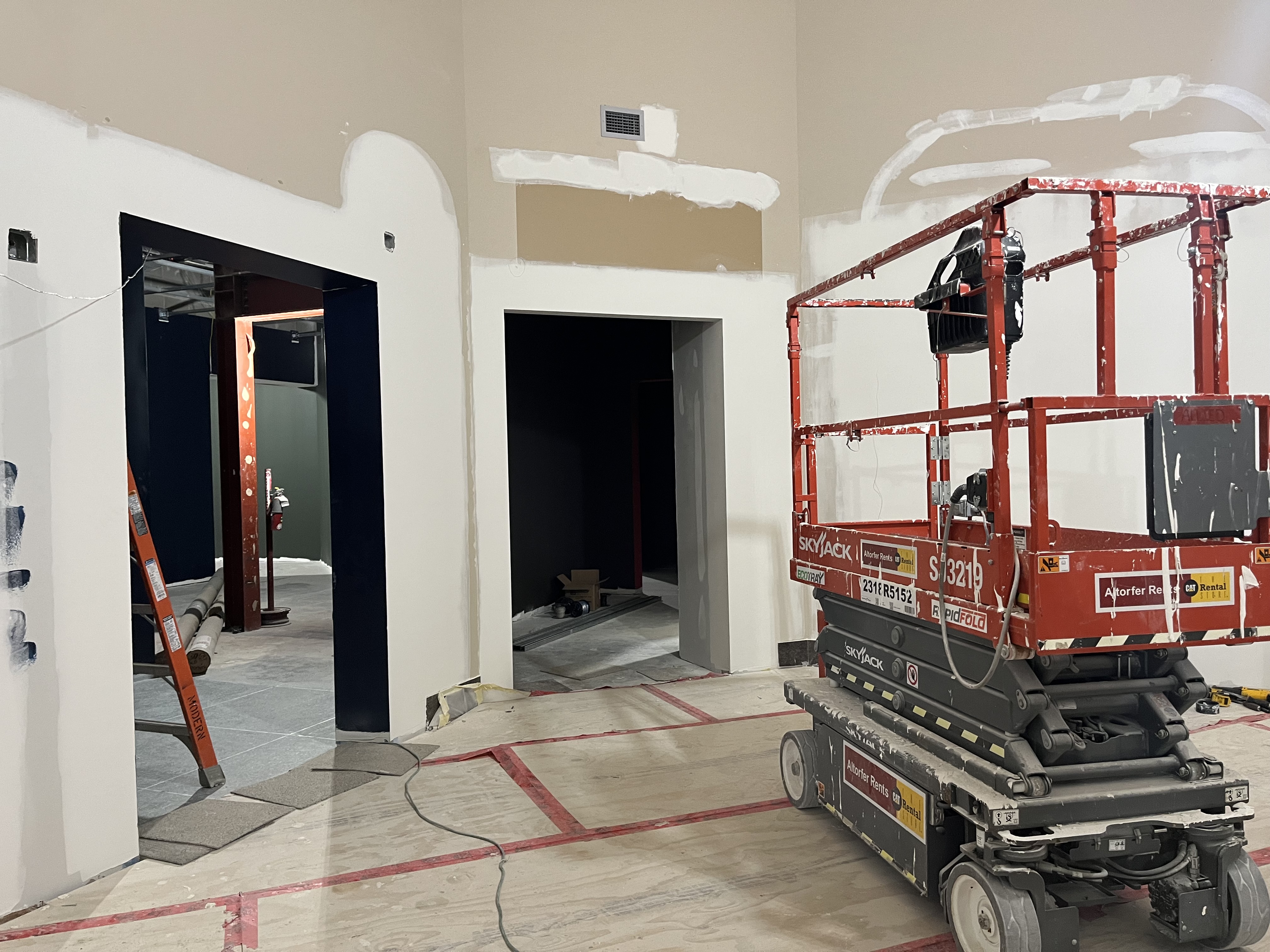 Silent video, pan shot of construction of museum expansion showing future reception desk and lobby area.