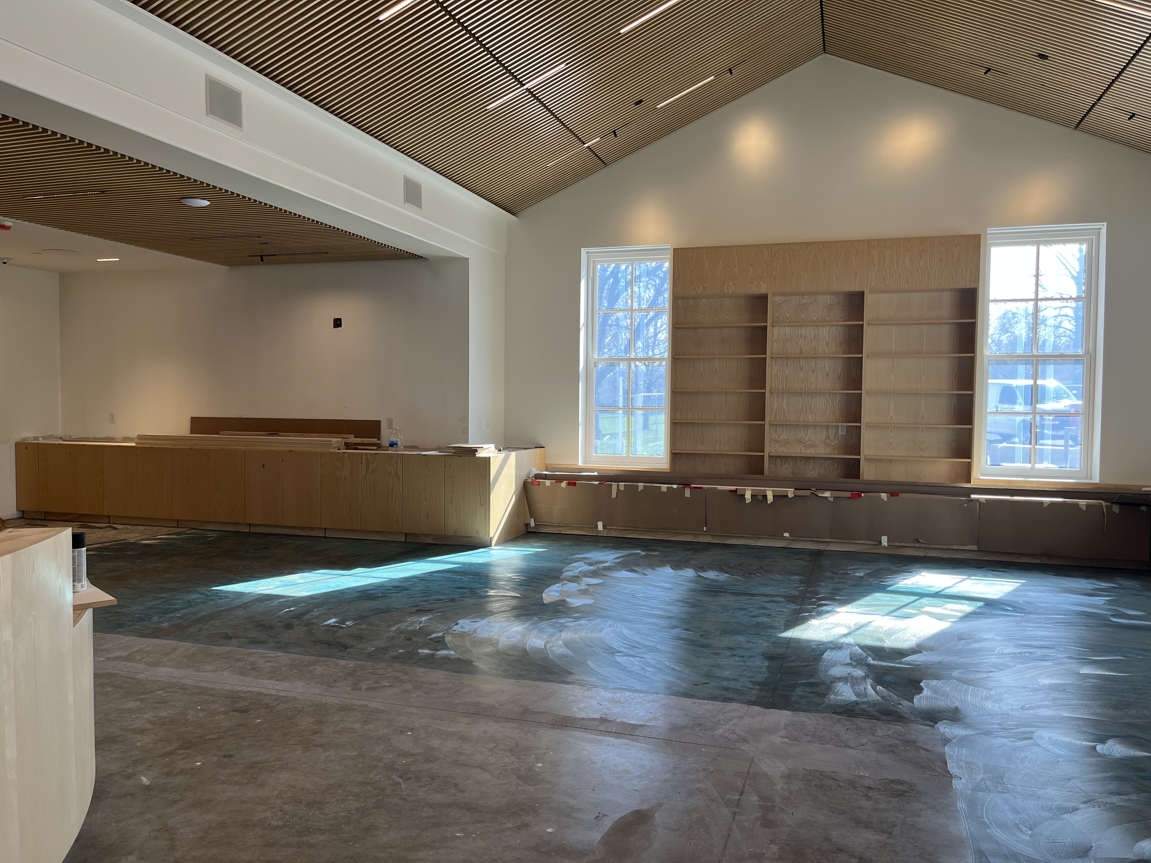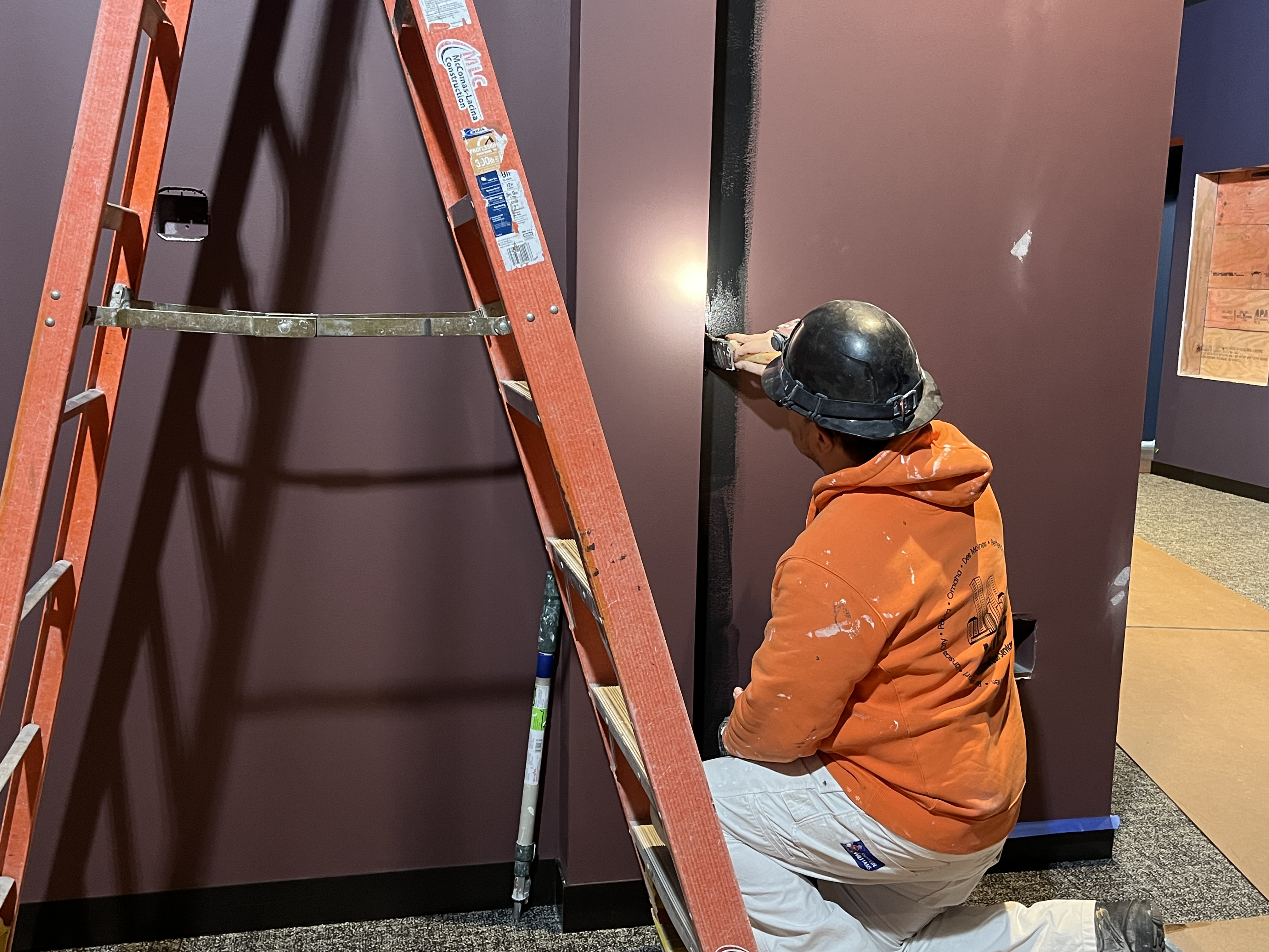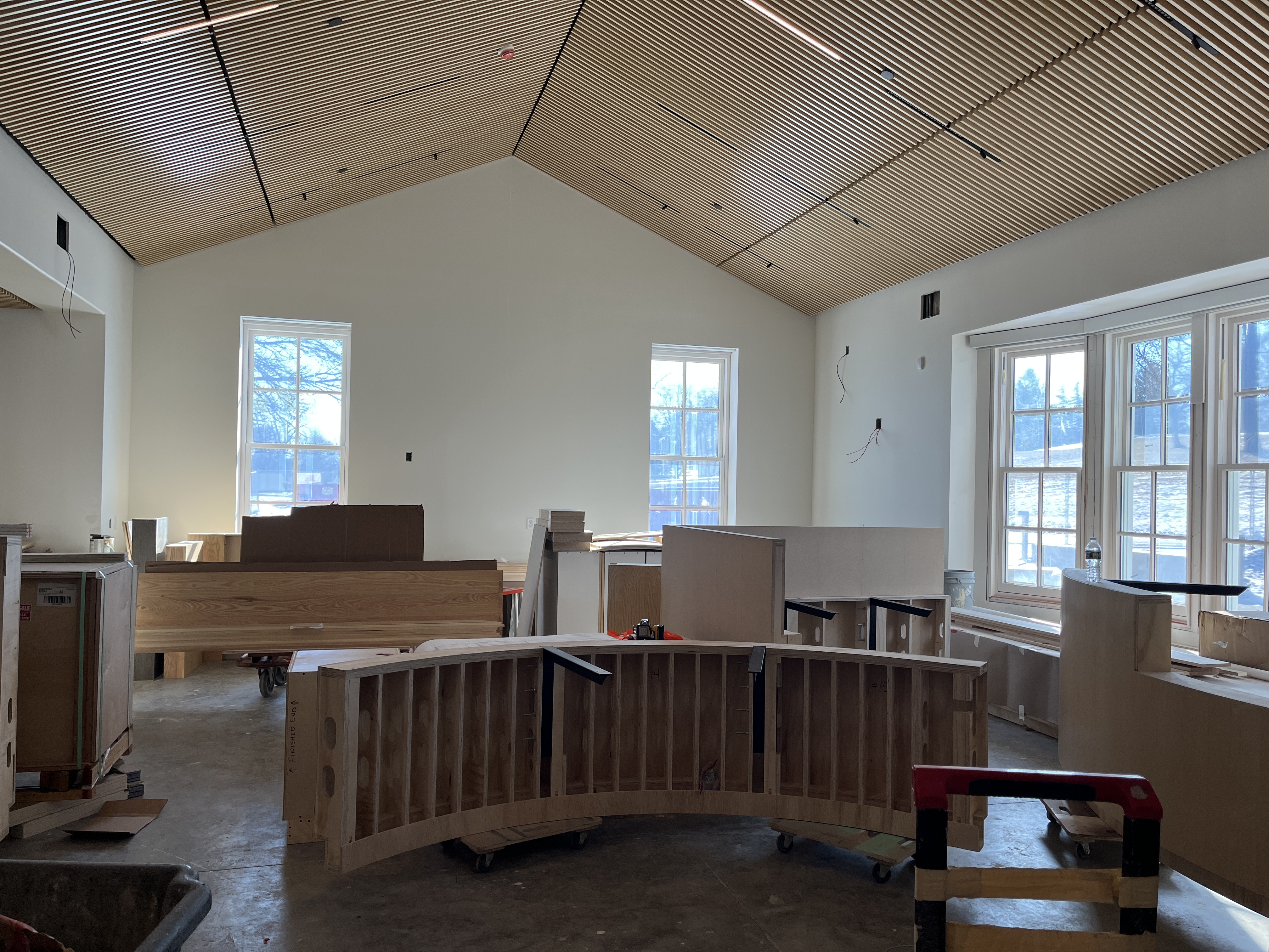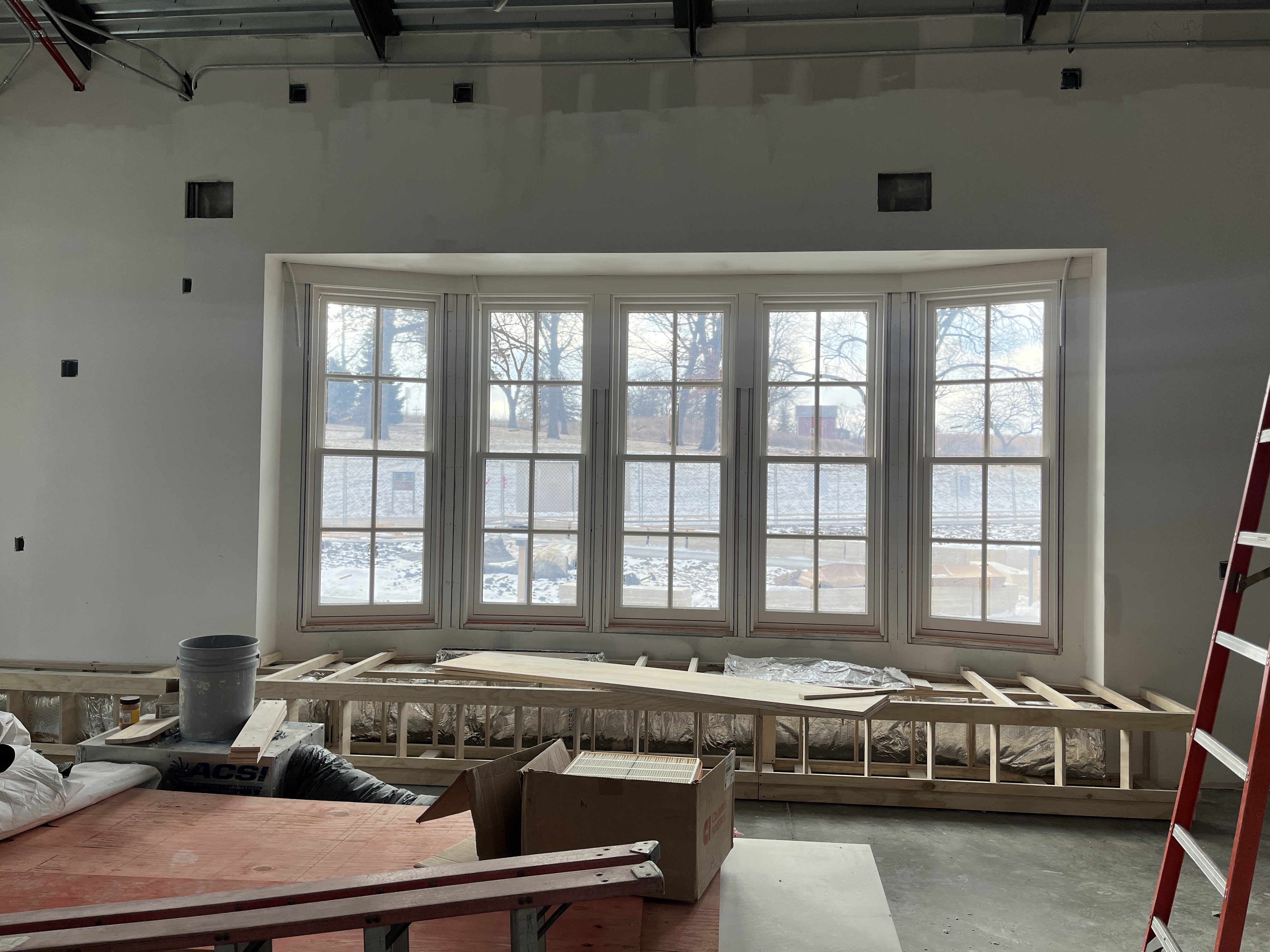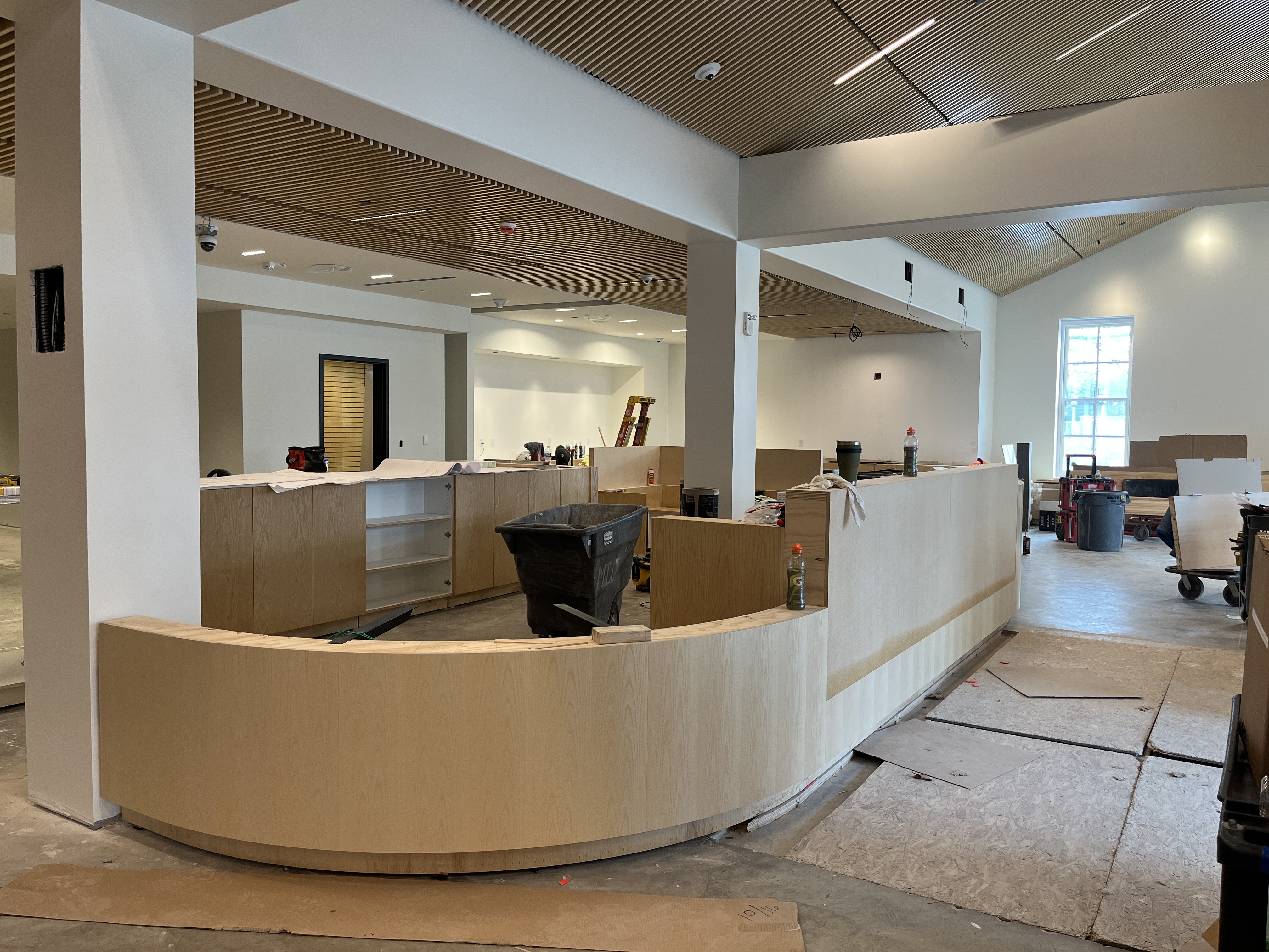 Silent video, pan shot of construction of museum expansion showing future reception desk and lobby area.