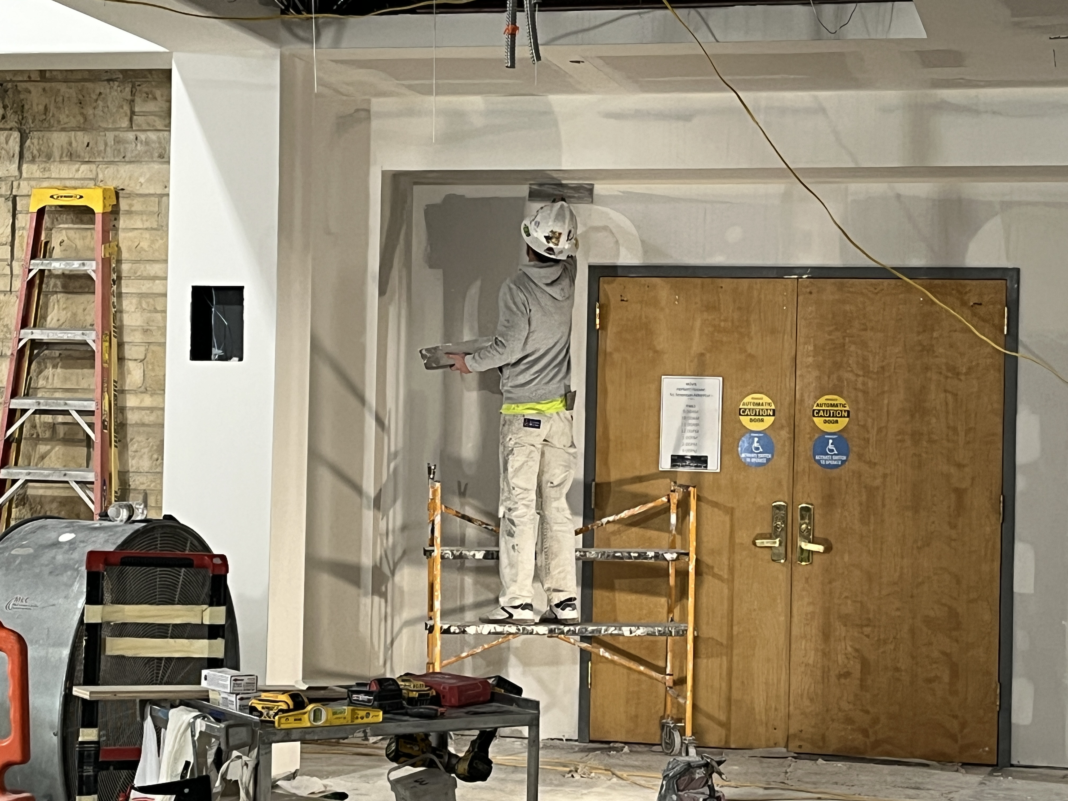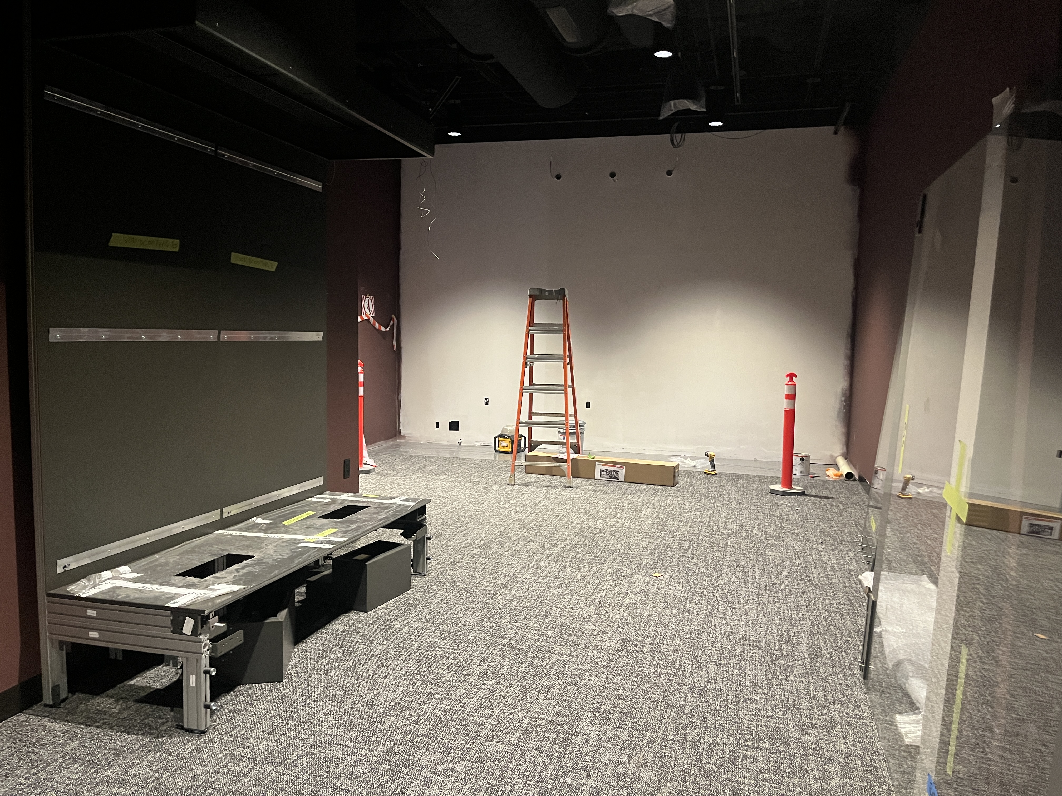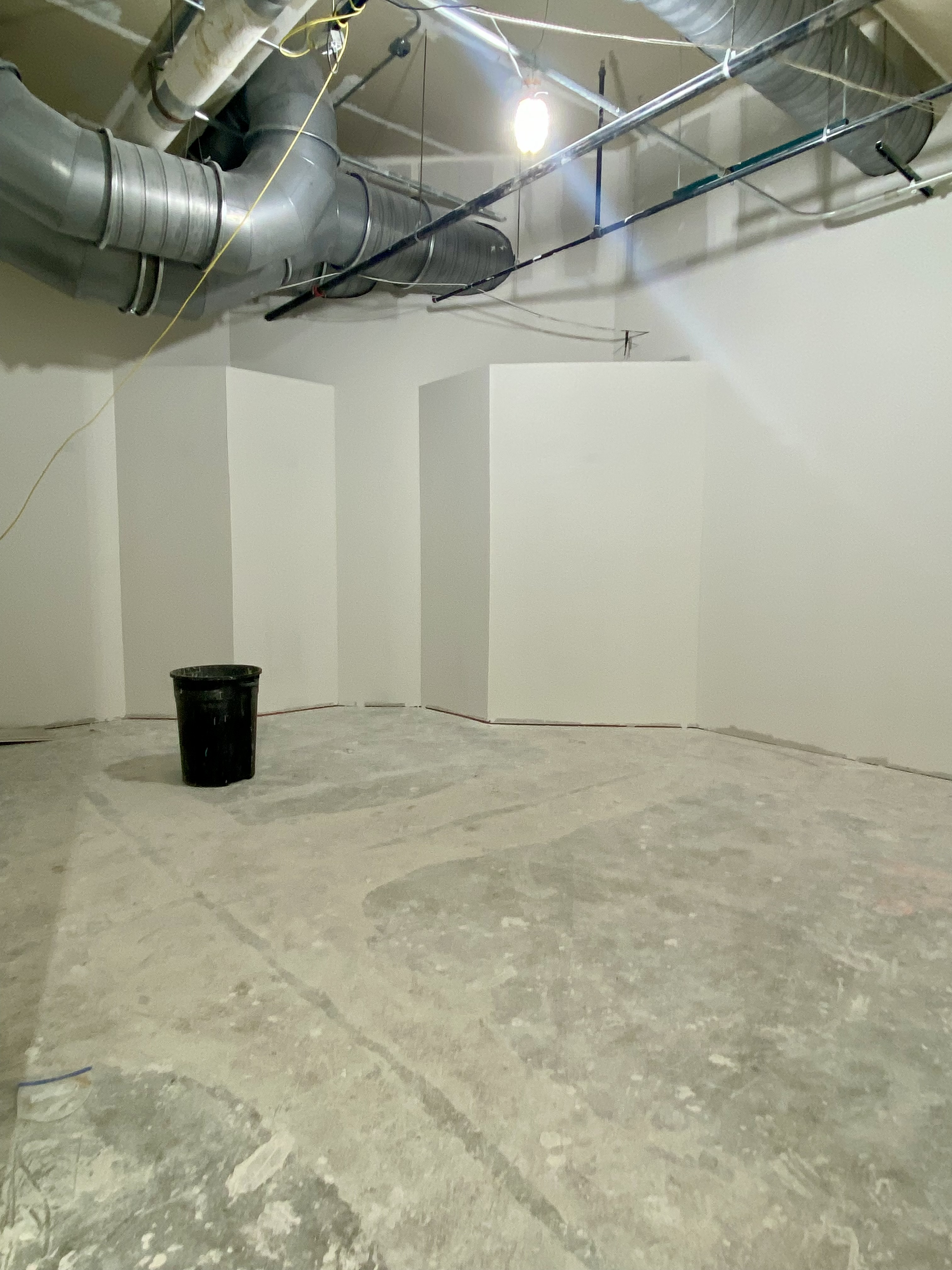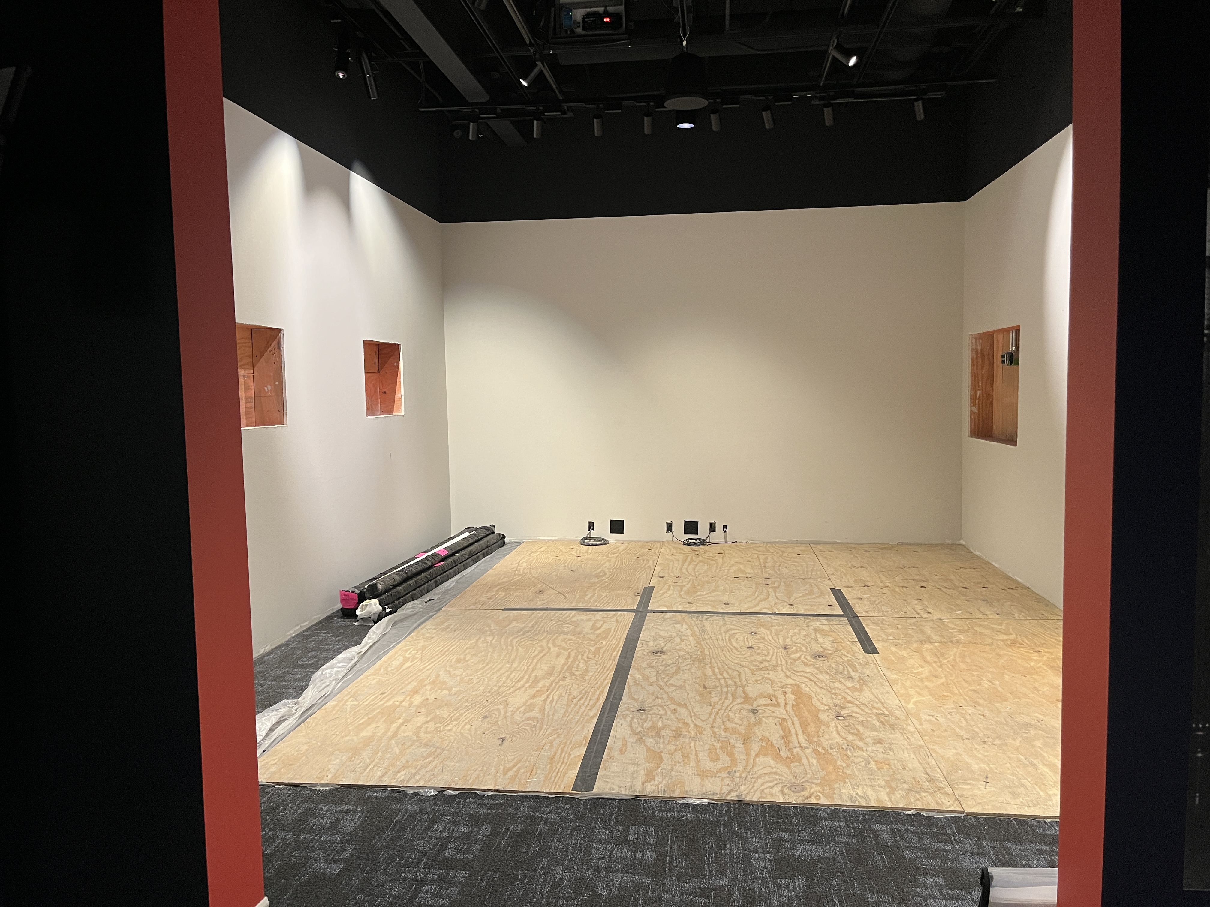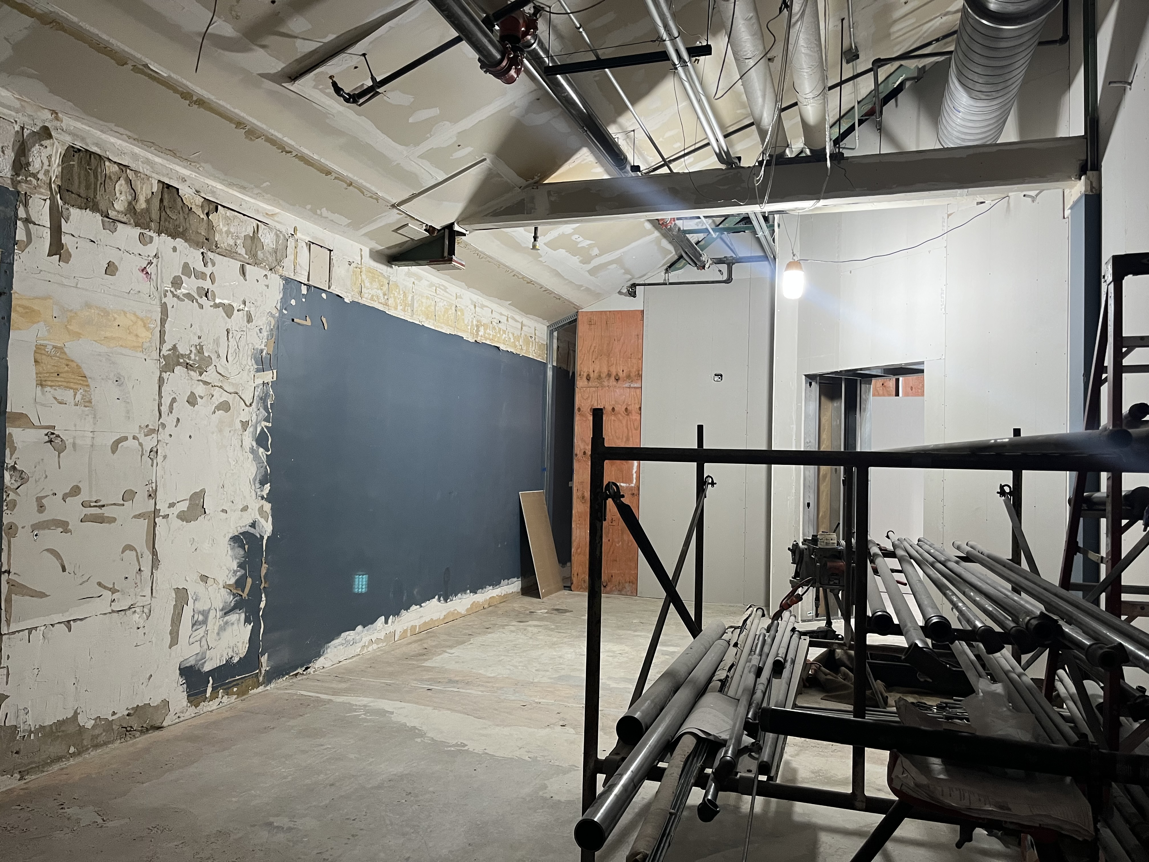 Silent video, pan shot of construction of museum expansion showing future reception desk and lobby area.