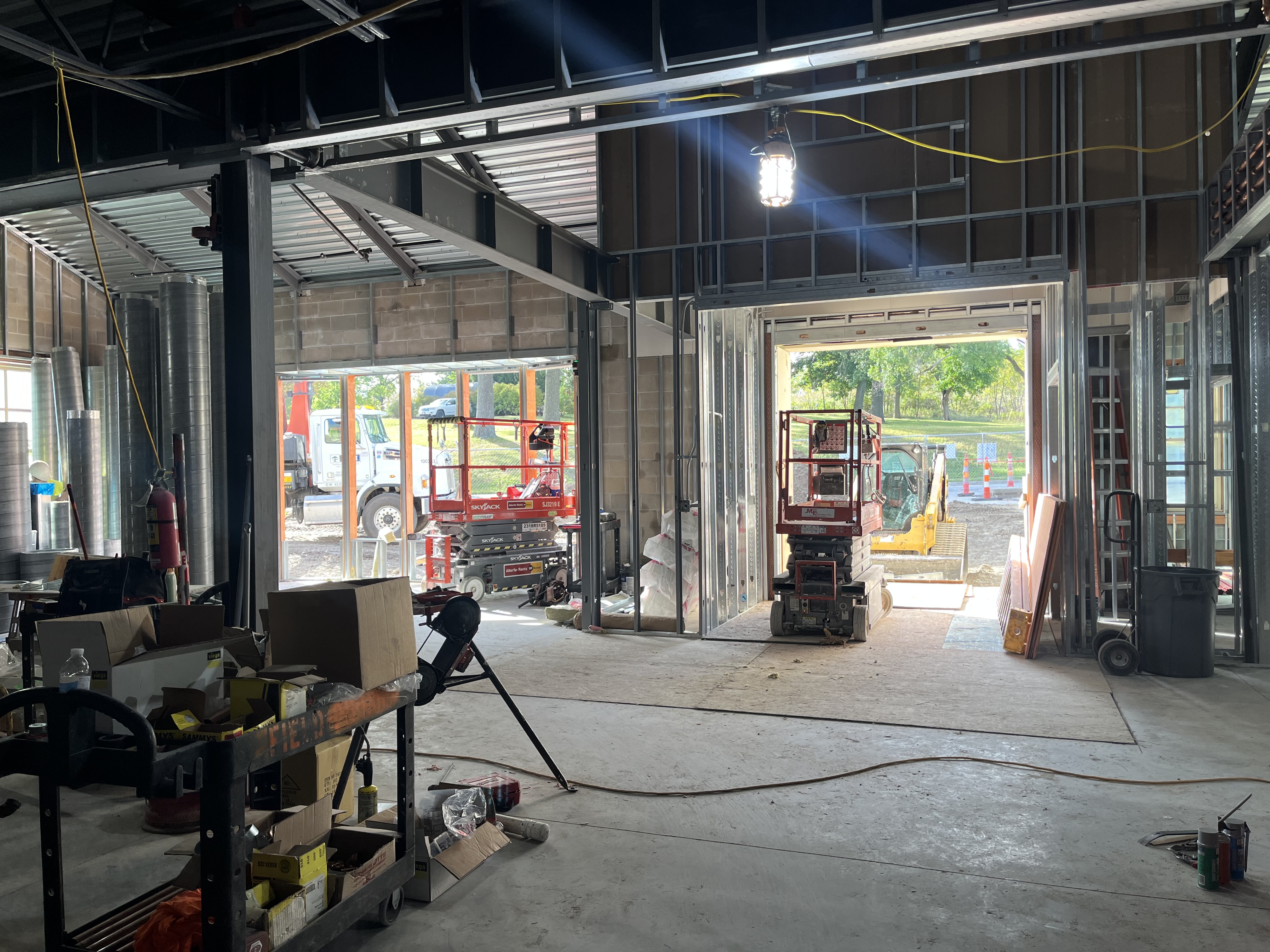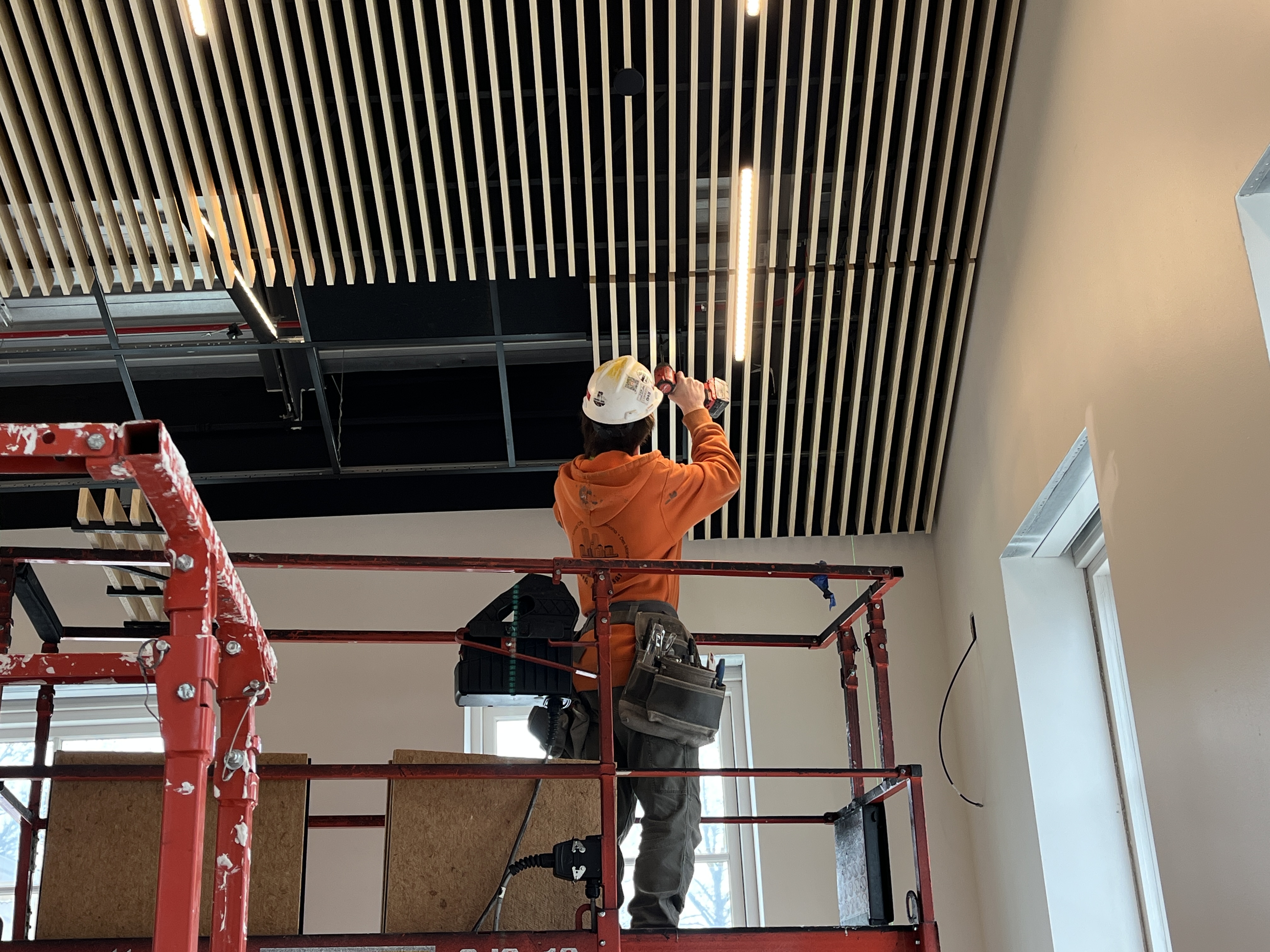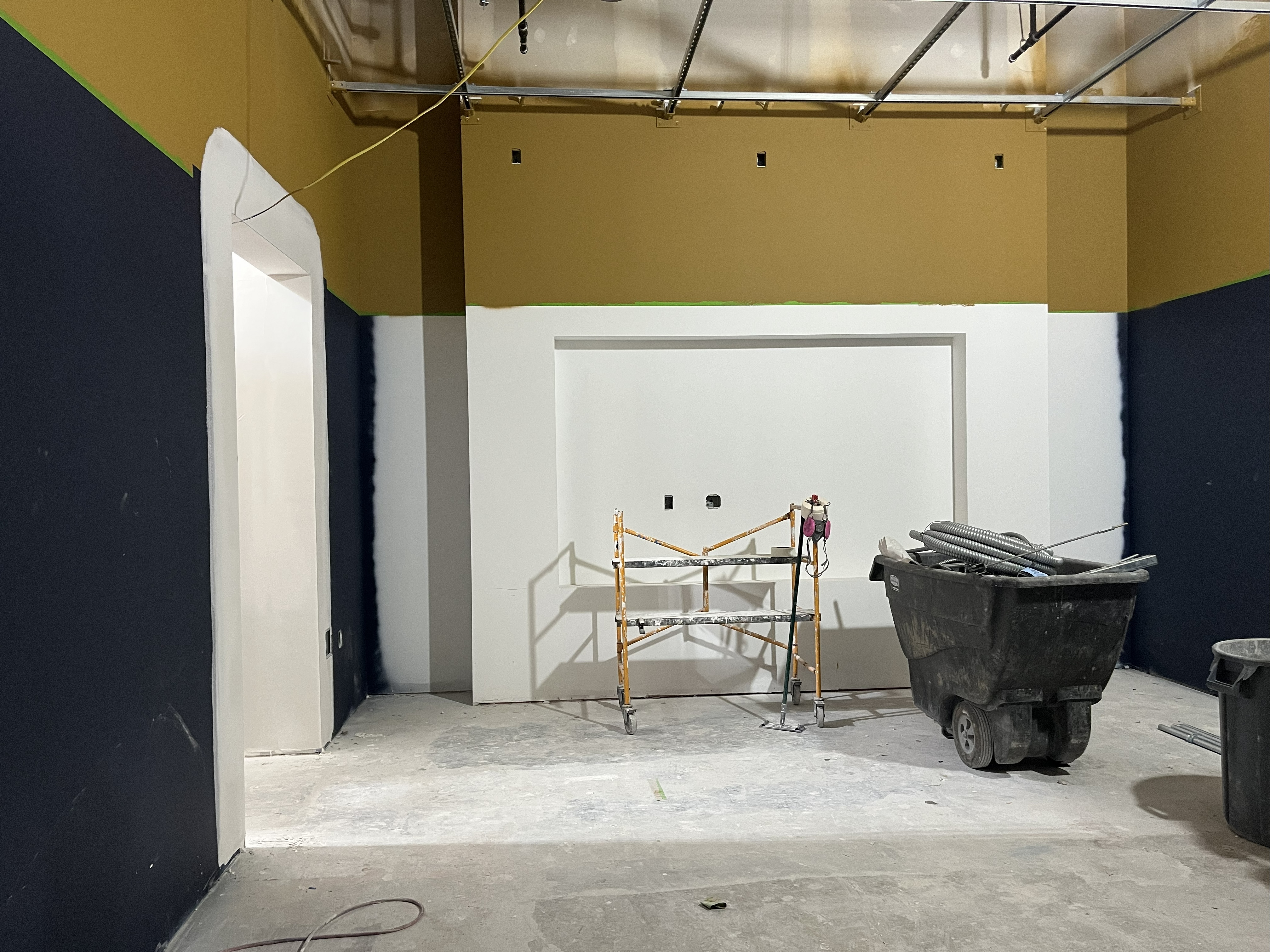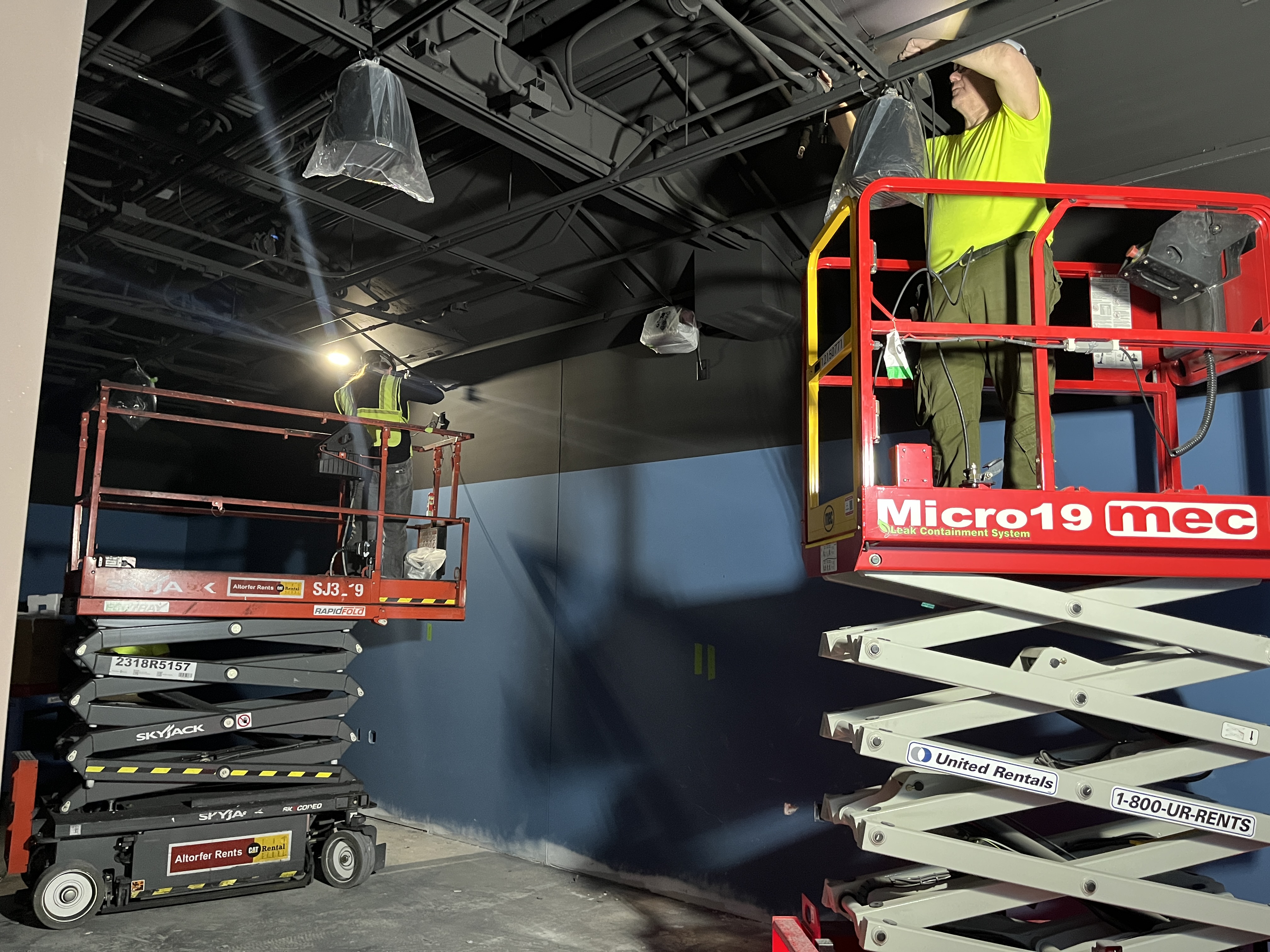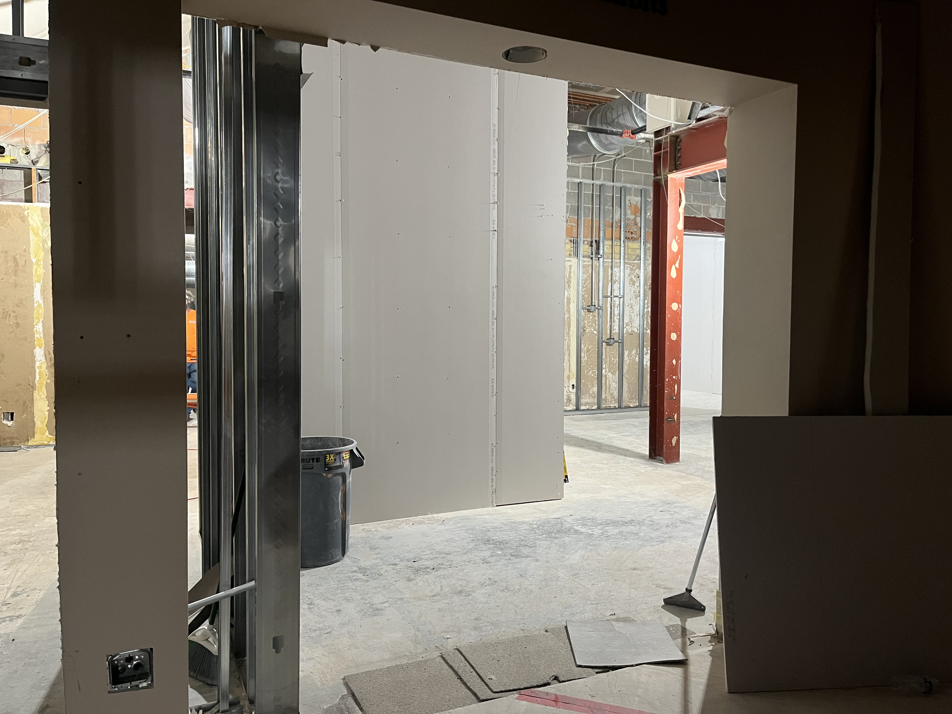 Silent video, pan shot of construction of museum expansion showing future reception desk and lobby area.