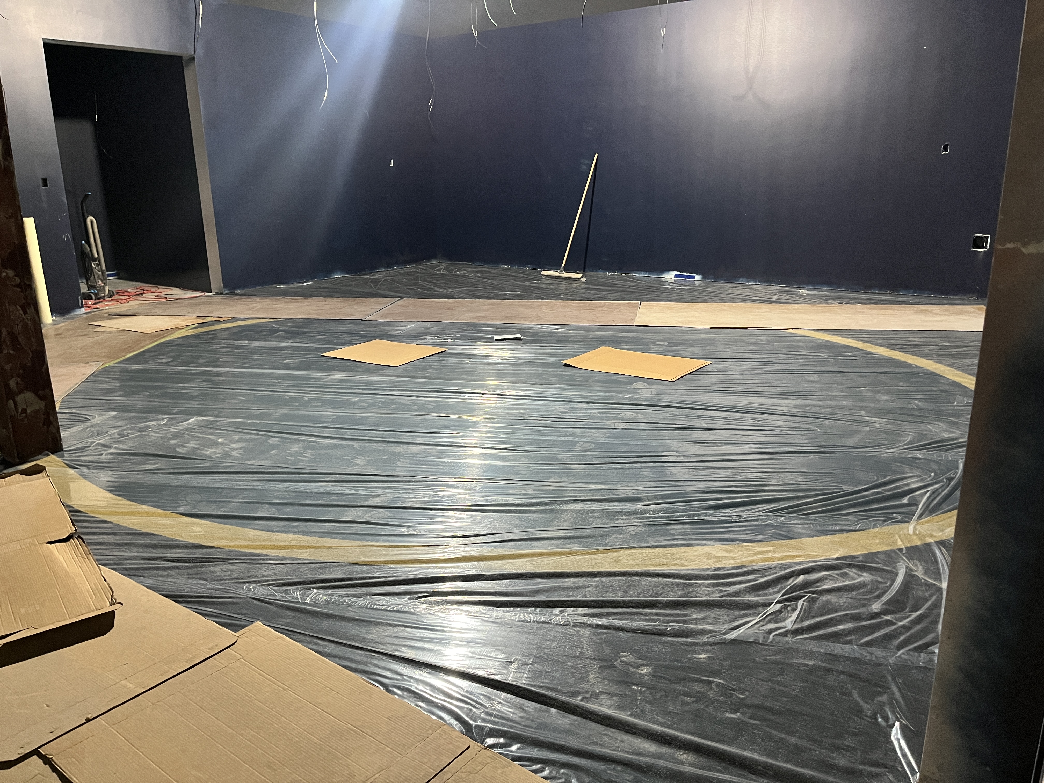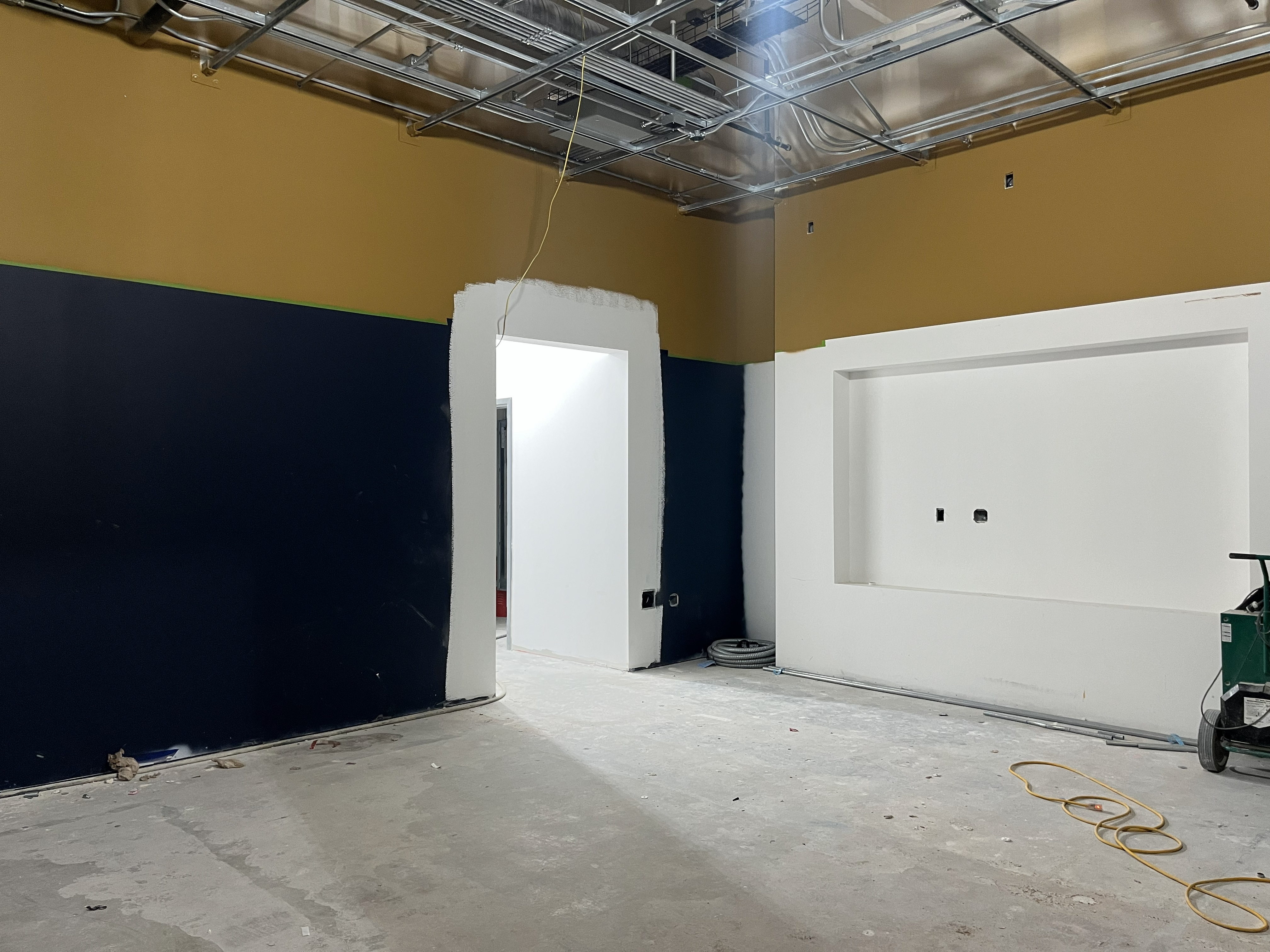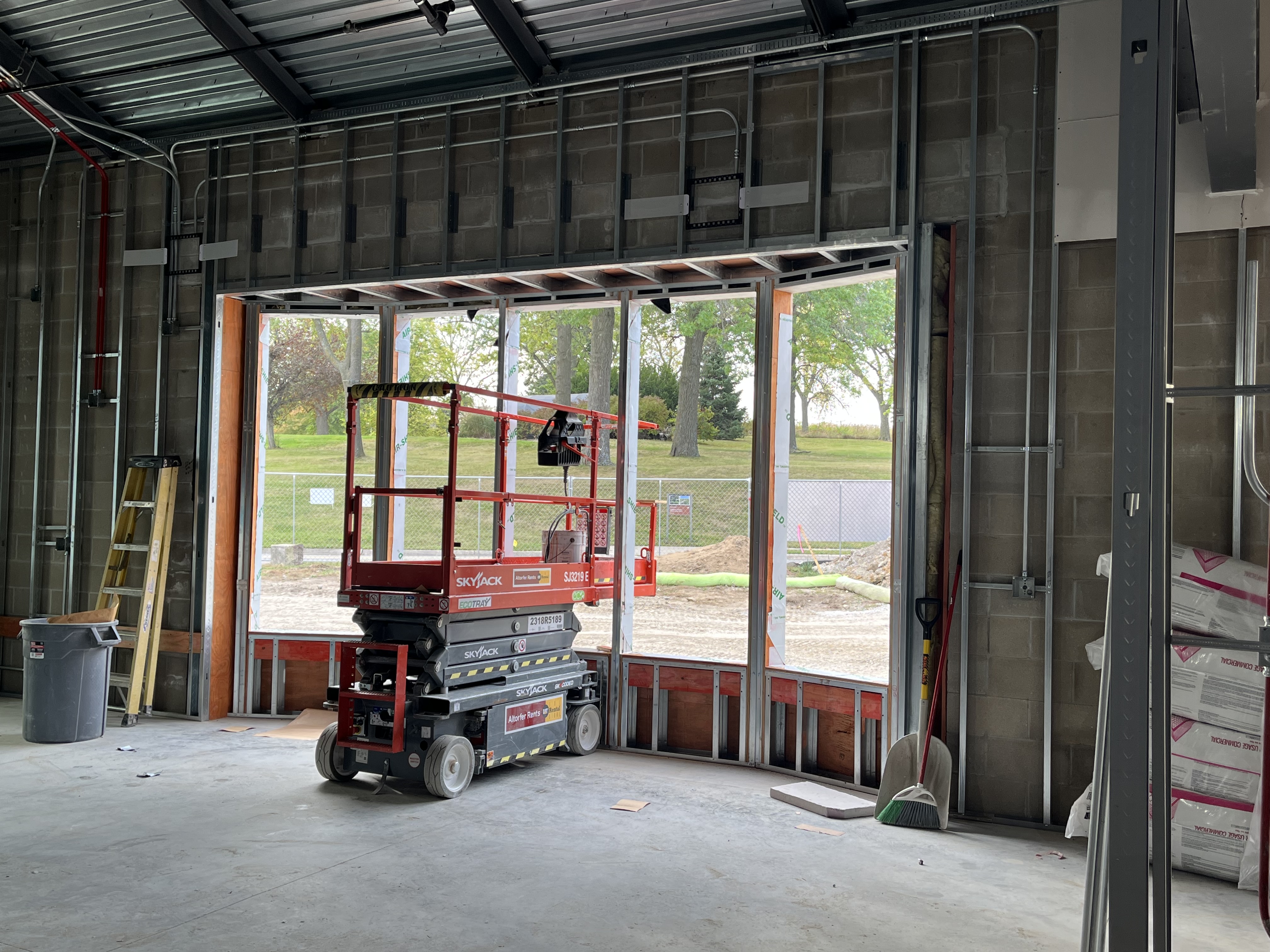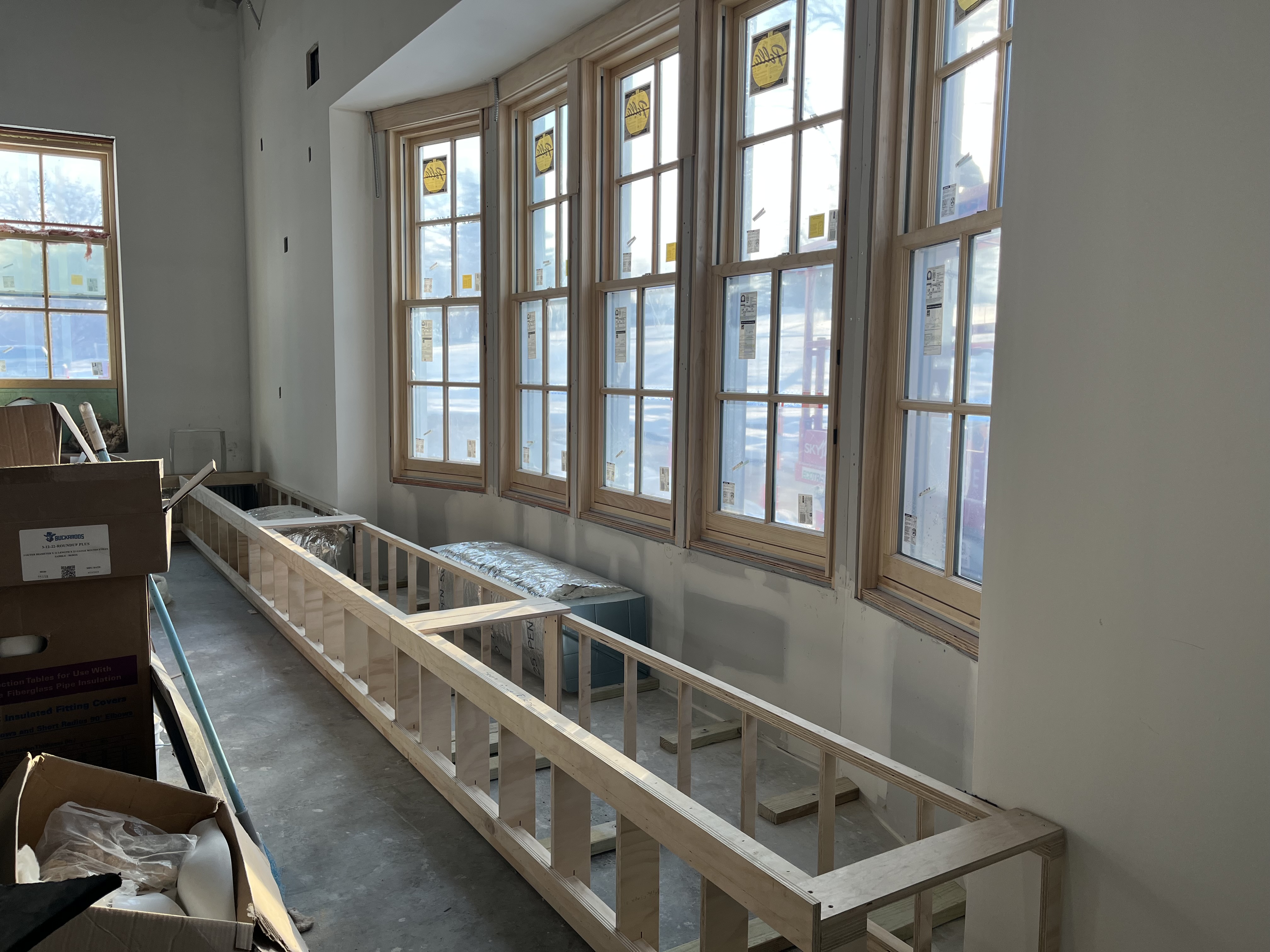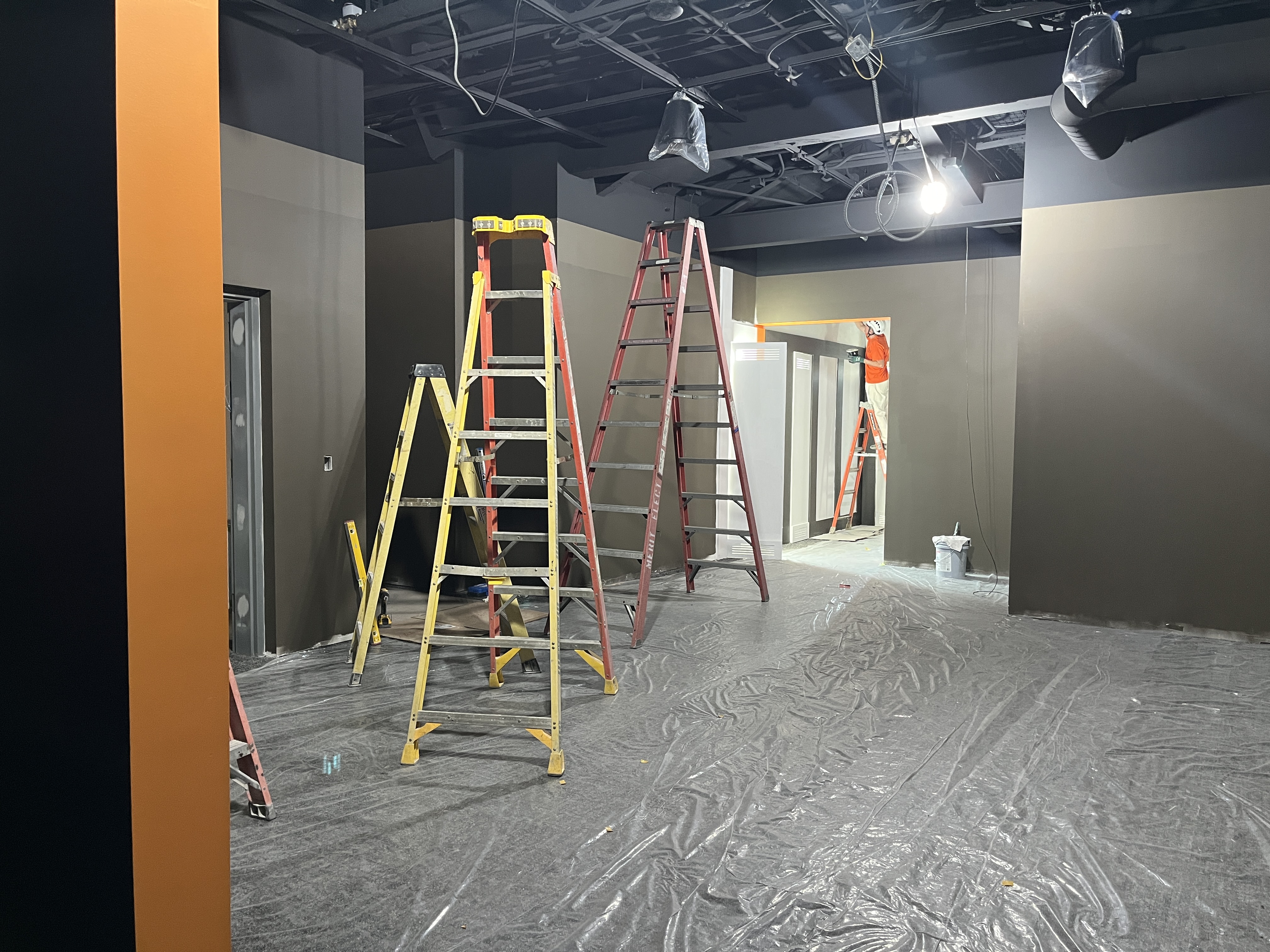 Silent video, pan shot of construction of museum expansion showing future reception desk and lobby area.