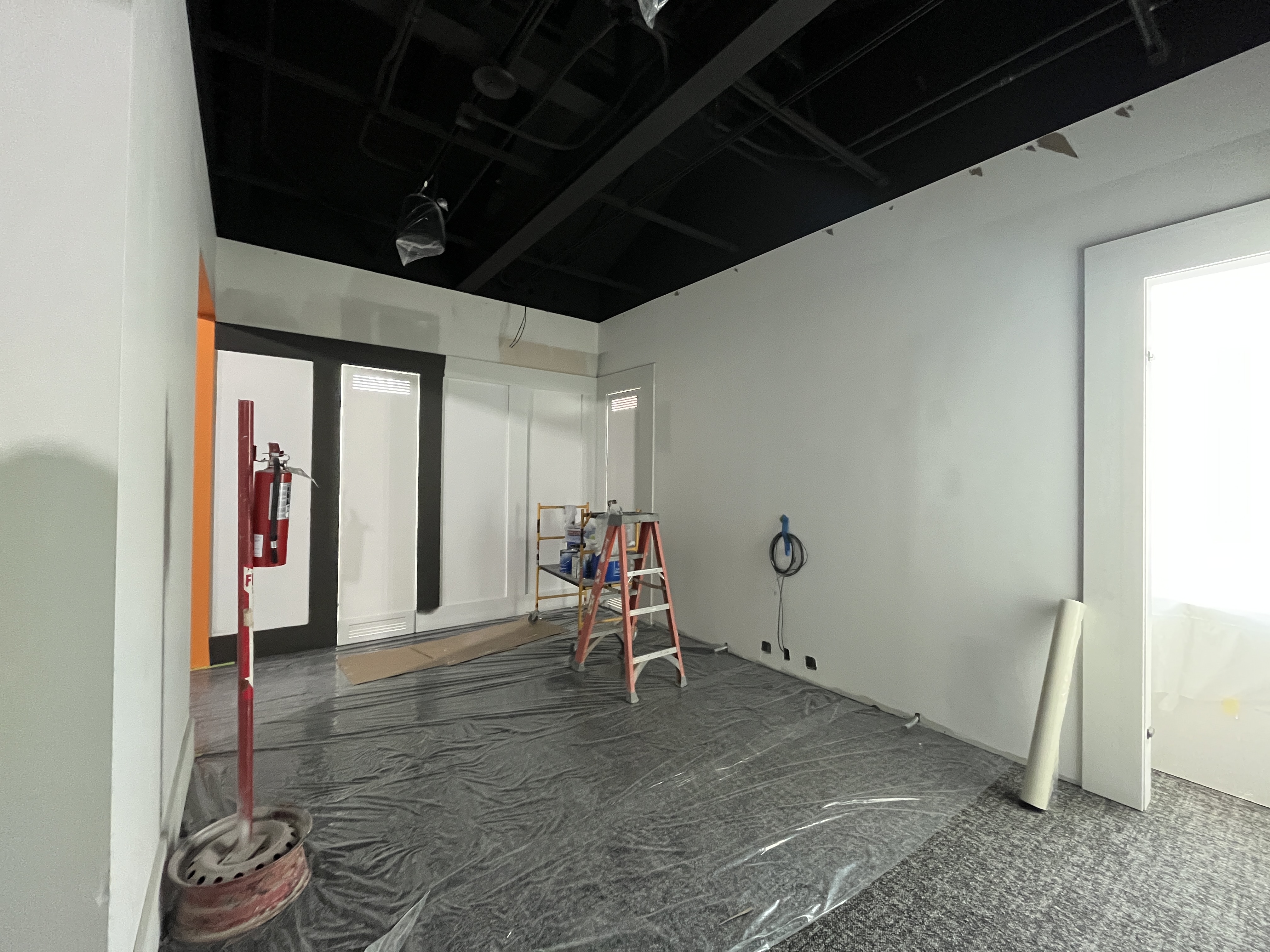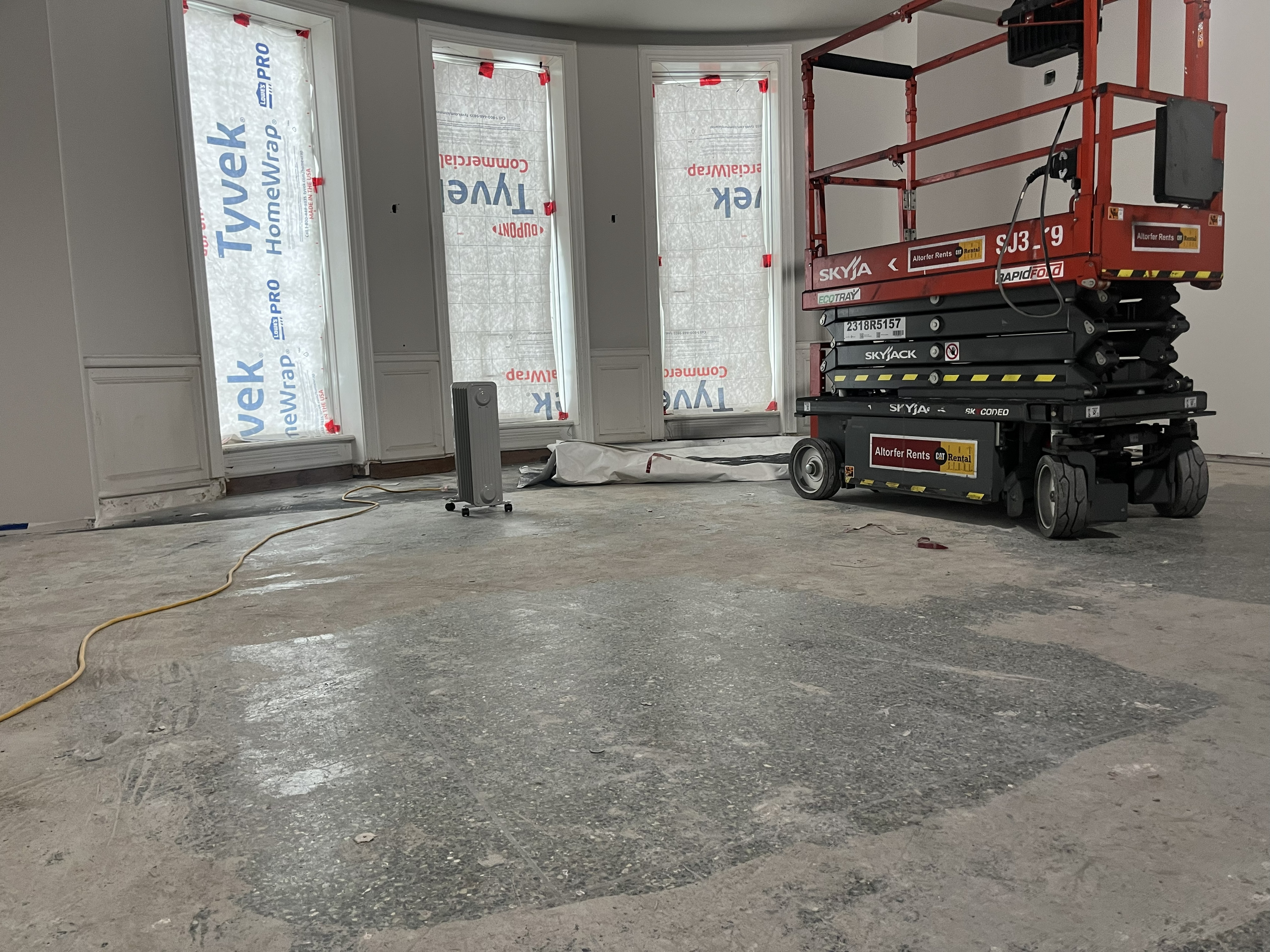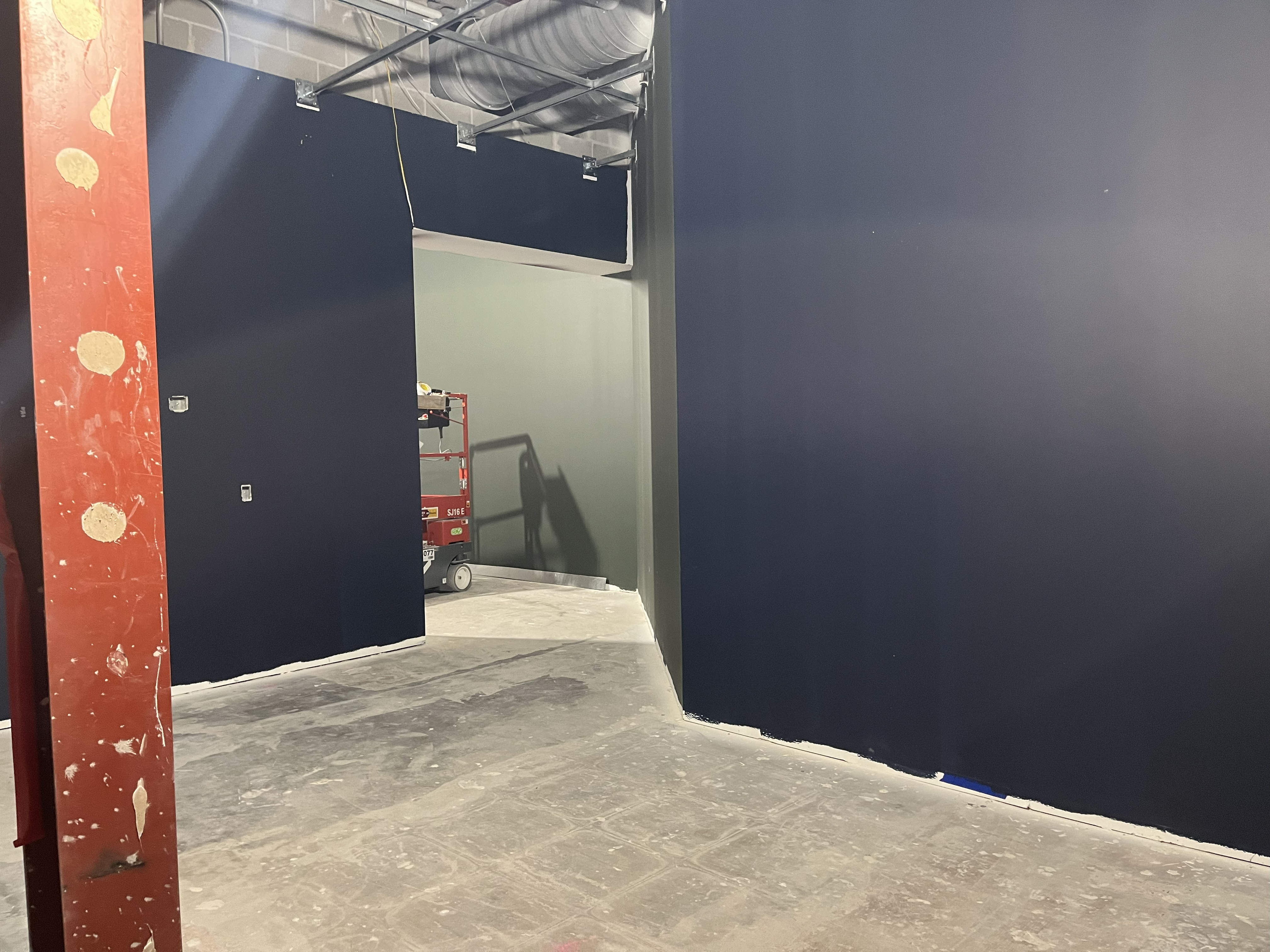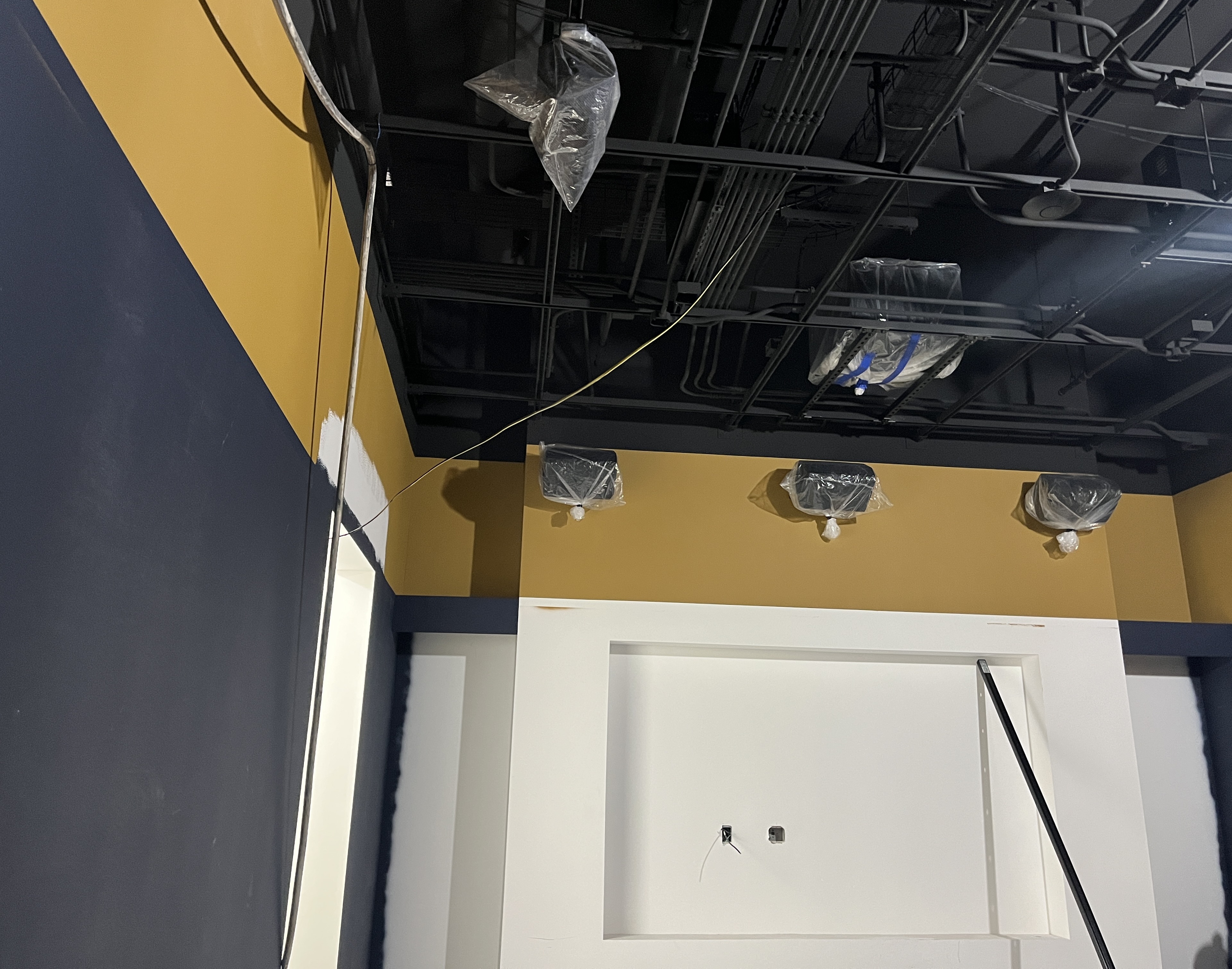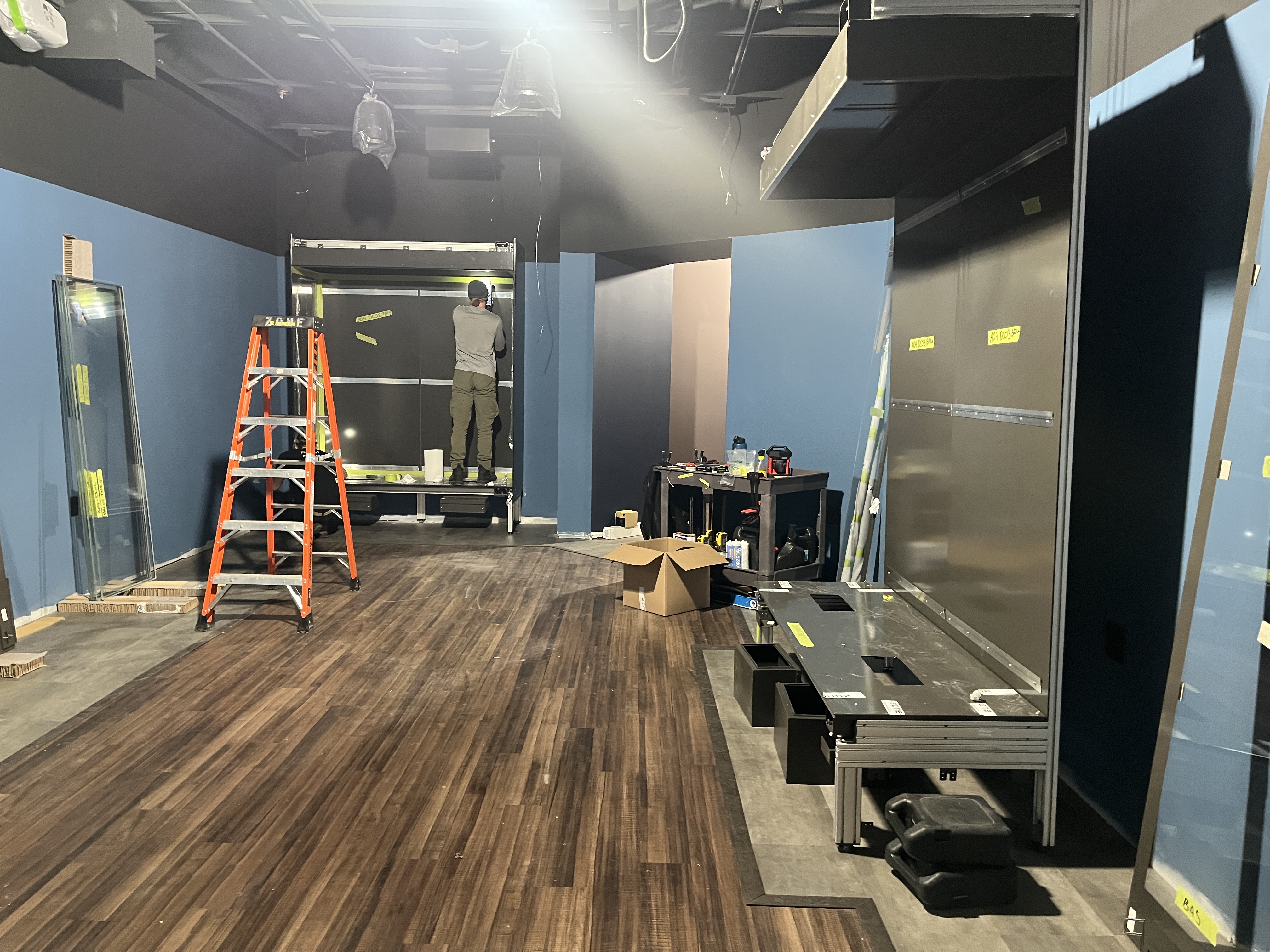 Silent video, pan shot of construction of museum expansion showing future reception desk and lobby area.